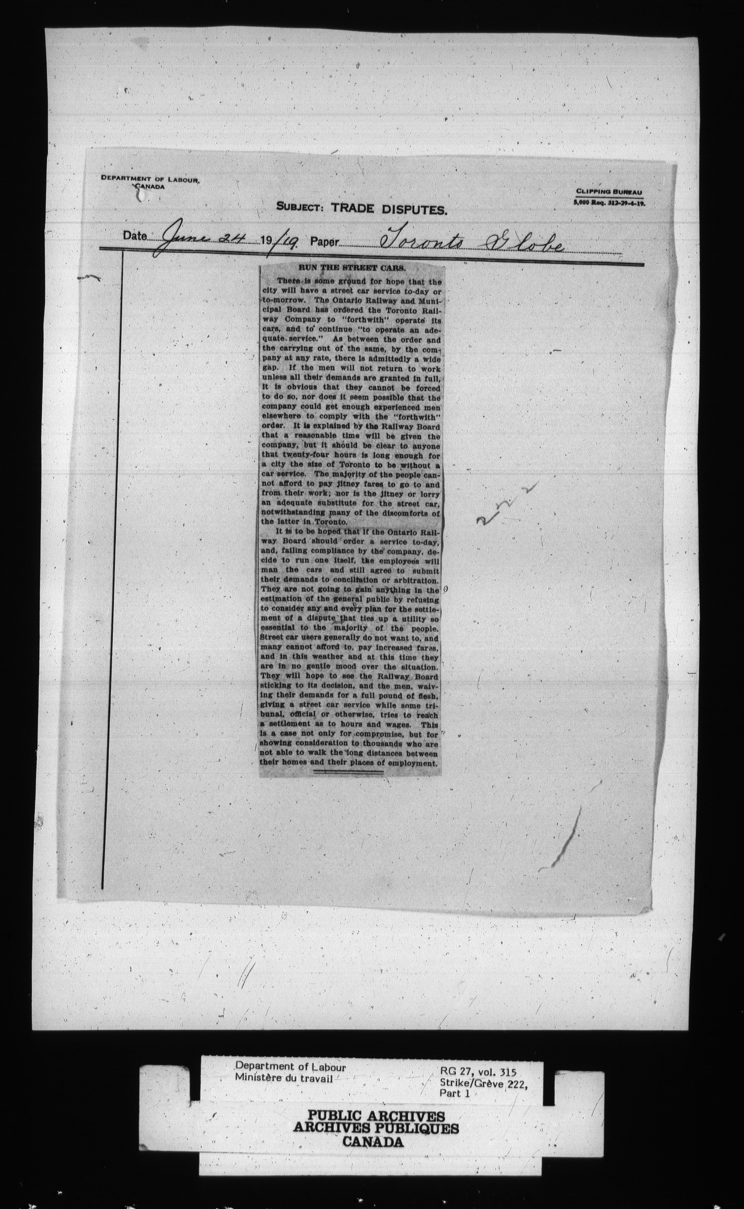 Department of Labour, Economics and Research Branch : Strikes and lockout files - 2701