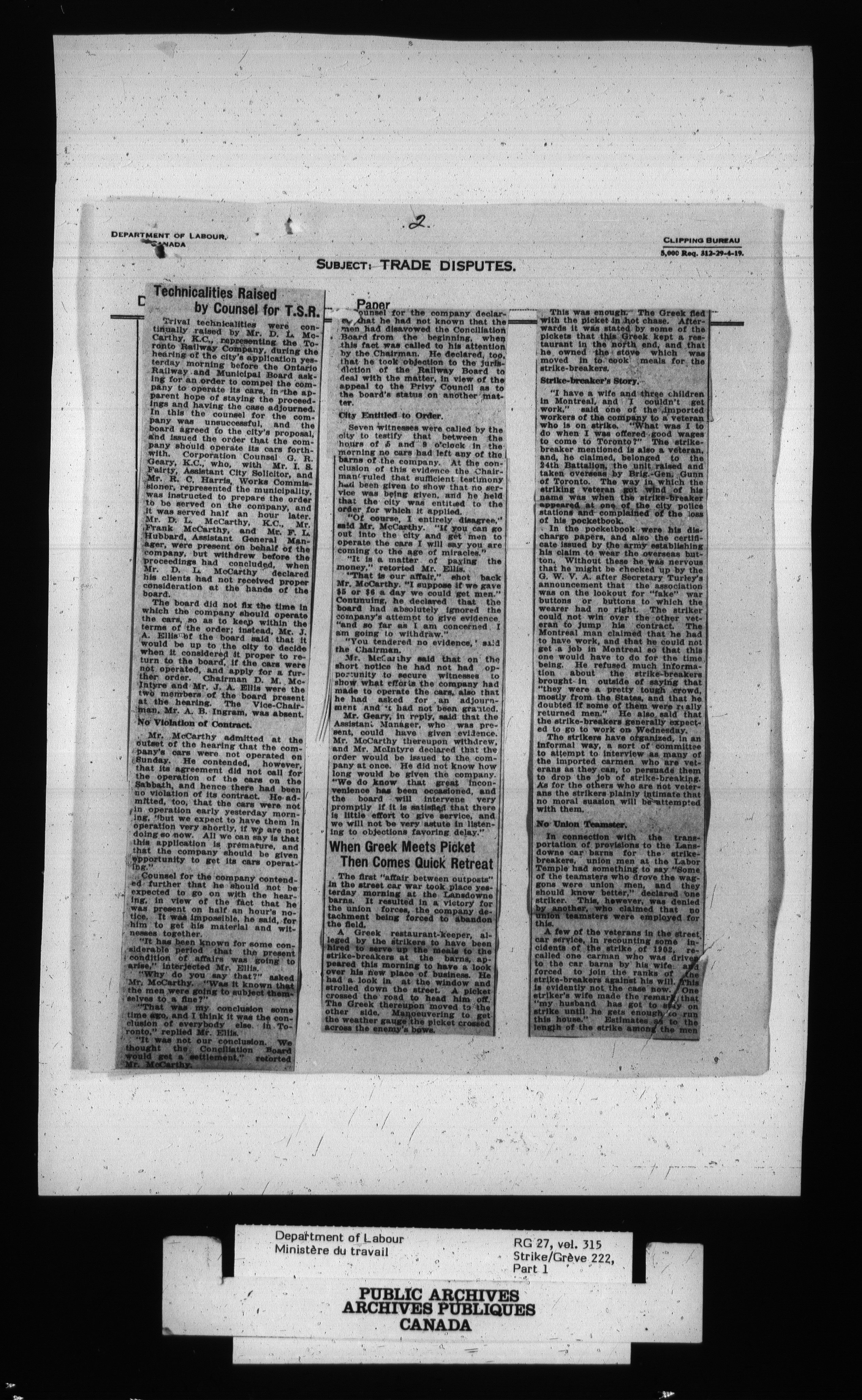 Department of Labour, Economics and Research Branch : Strikes and lockout files - 2701