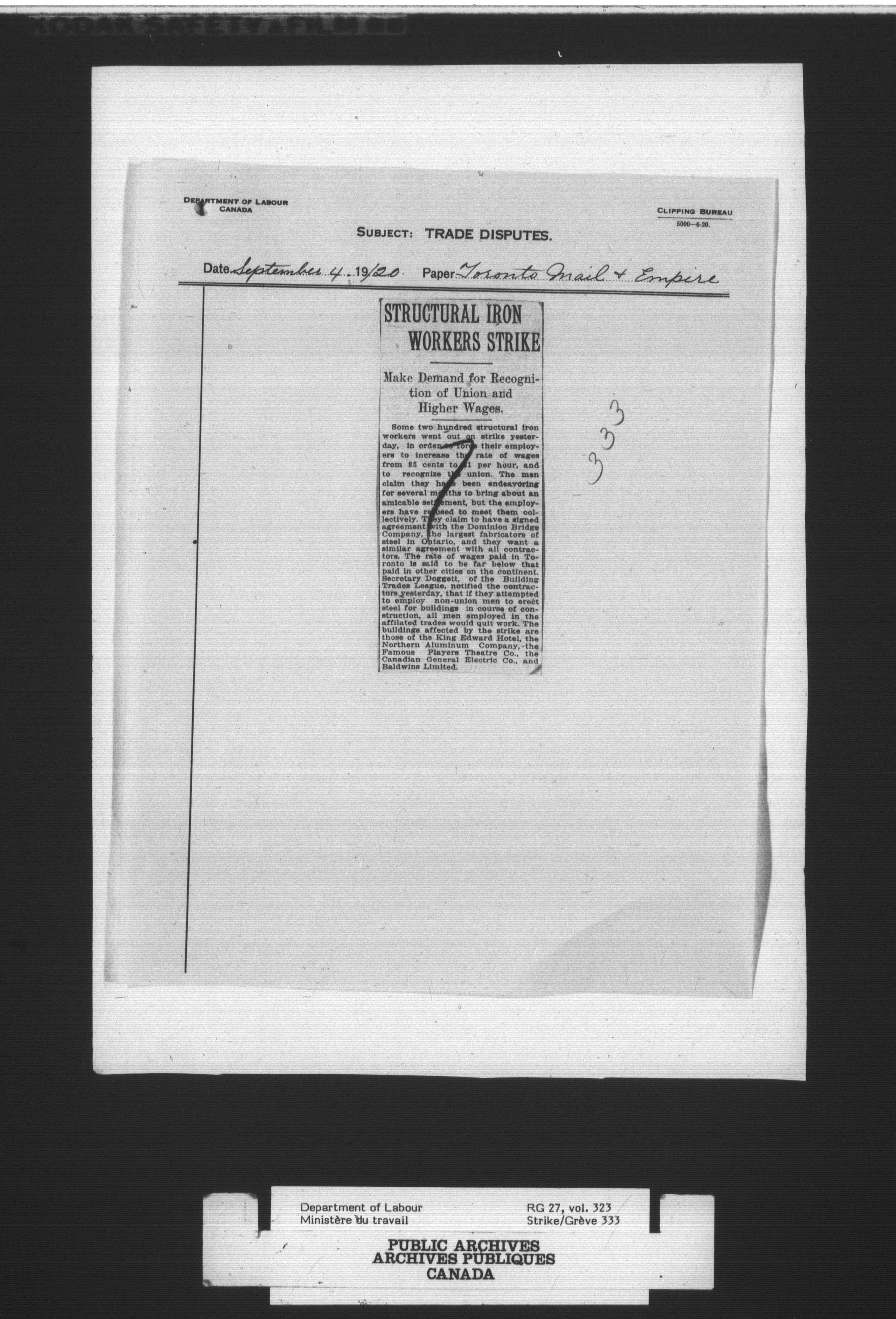 Department of Labour, Economics and Research Branch : Strikes and lockout files : T-2707