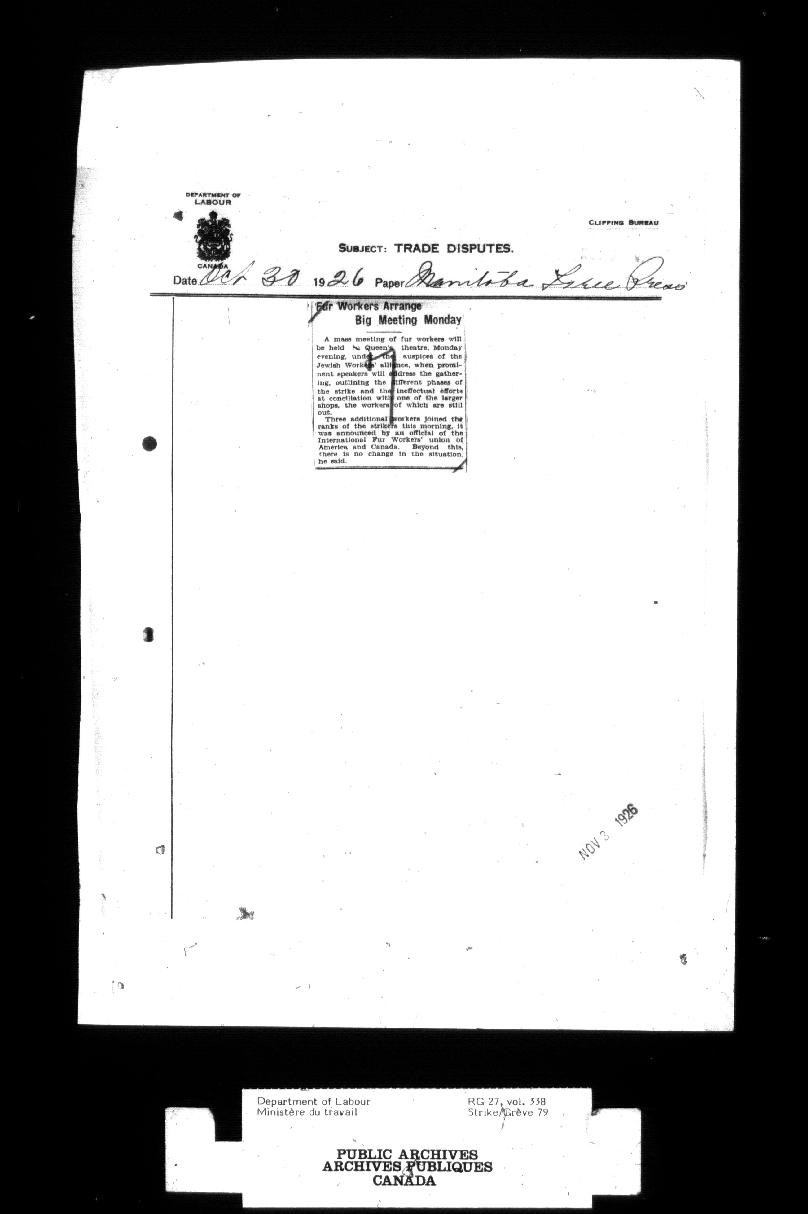 Department of Labour, Economics and Research Branch : Strikes and lockout files - 2749