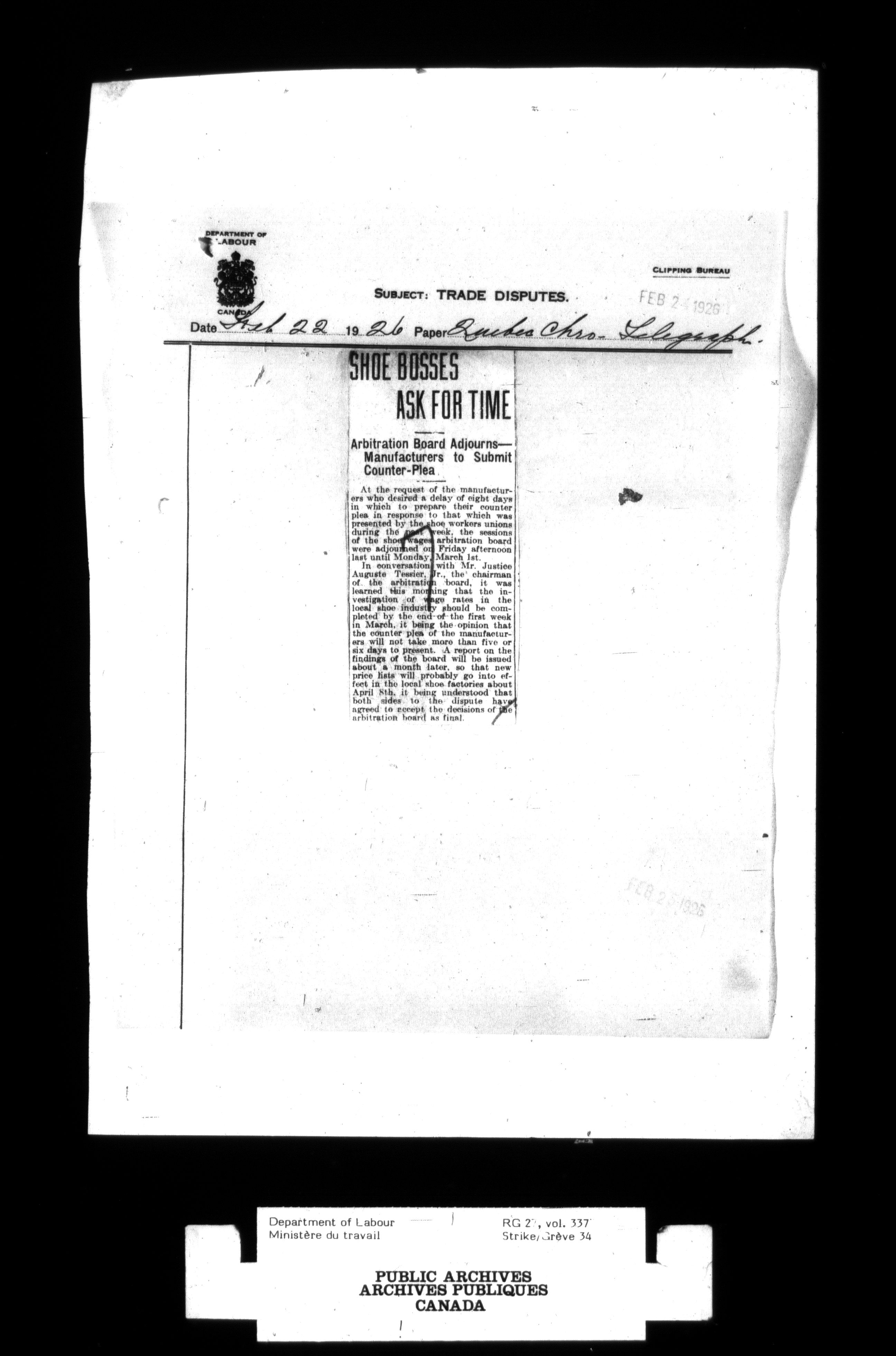 Department of Labour, Economics and Research Branch : Strikes and lockout files - 2749