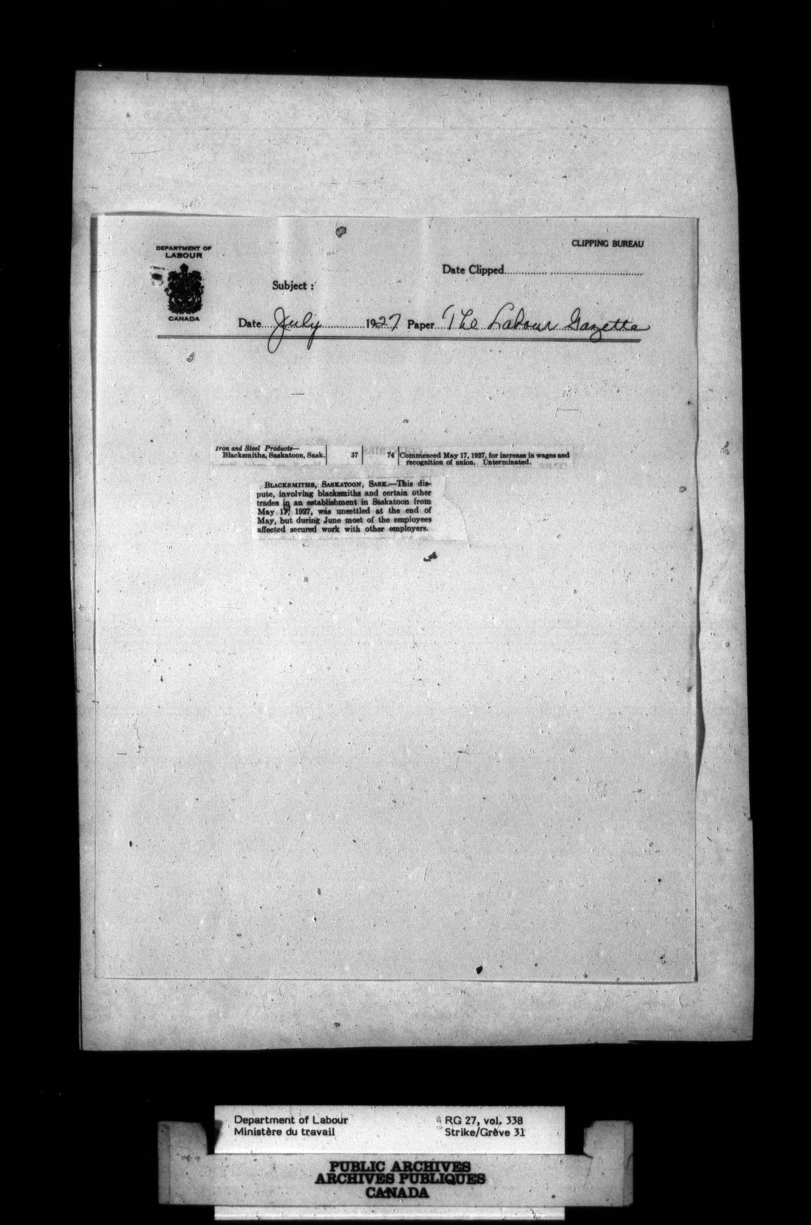 Department of Labour, Economics and Research Branch : Strikes and lockout files - 2750