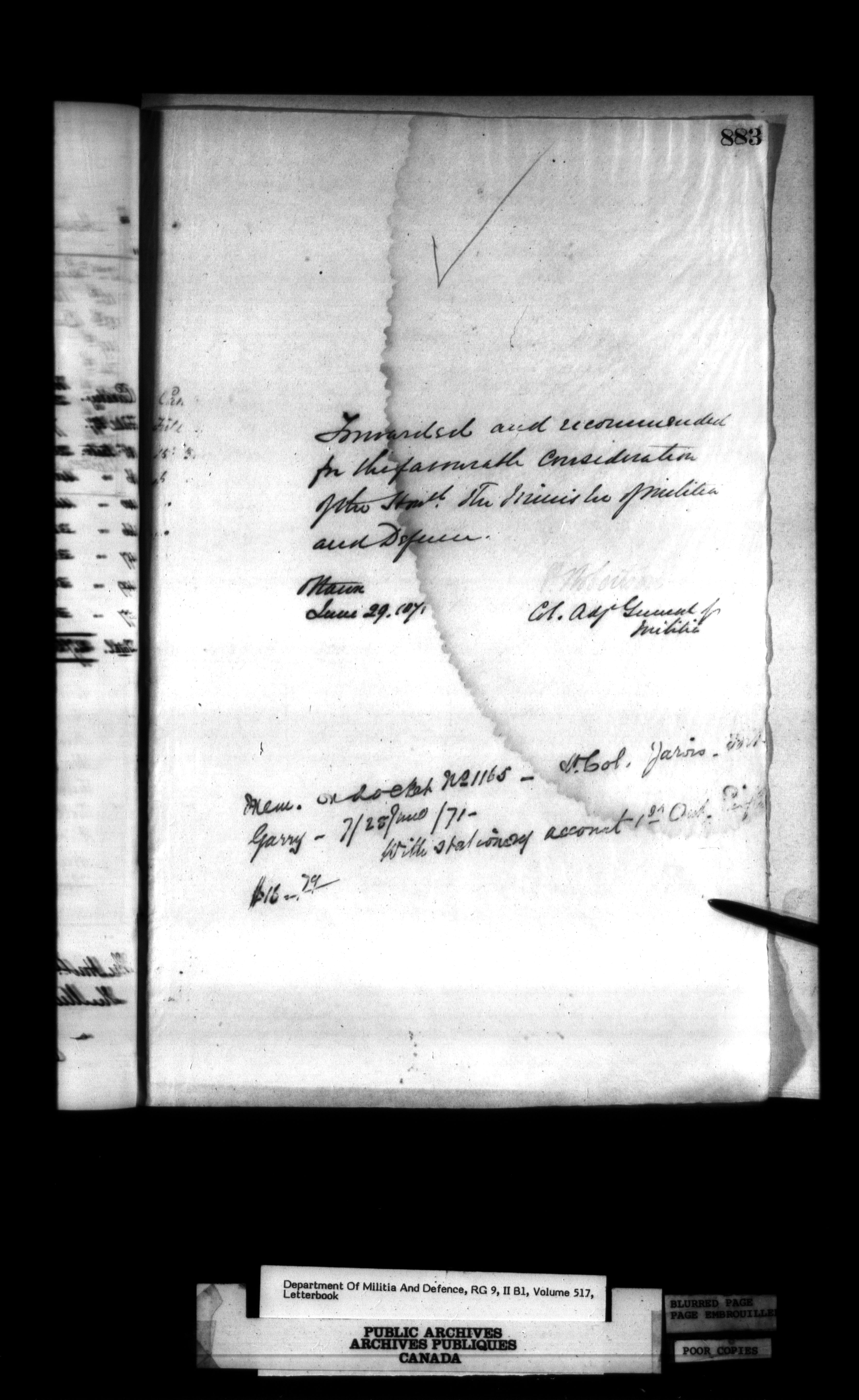Correspondence of the General Officer Commanding (GOC) of the Canadian Militia and his predecessor, the Adjutant General - 285