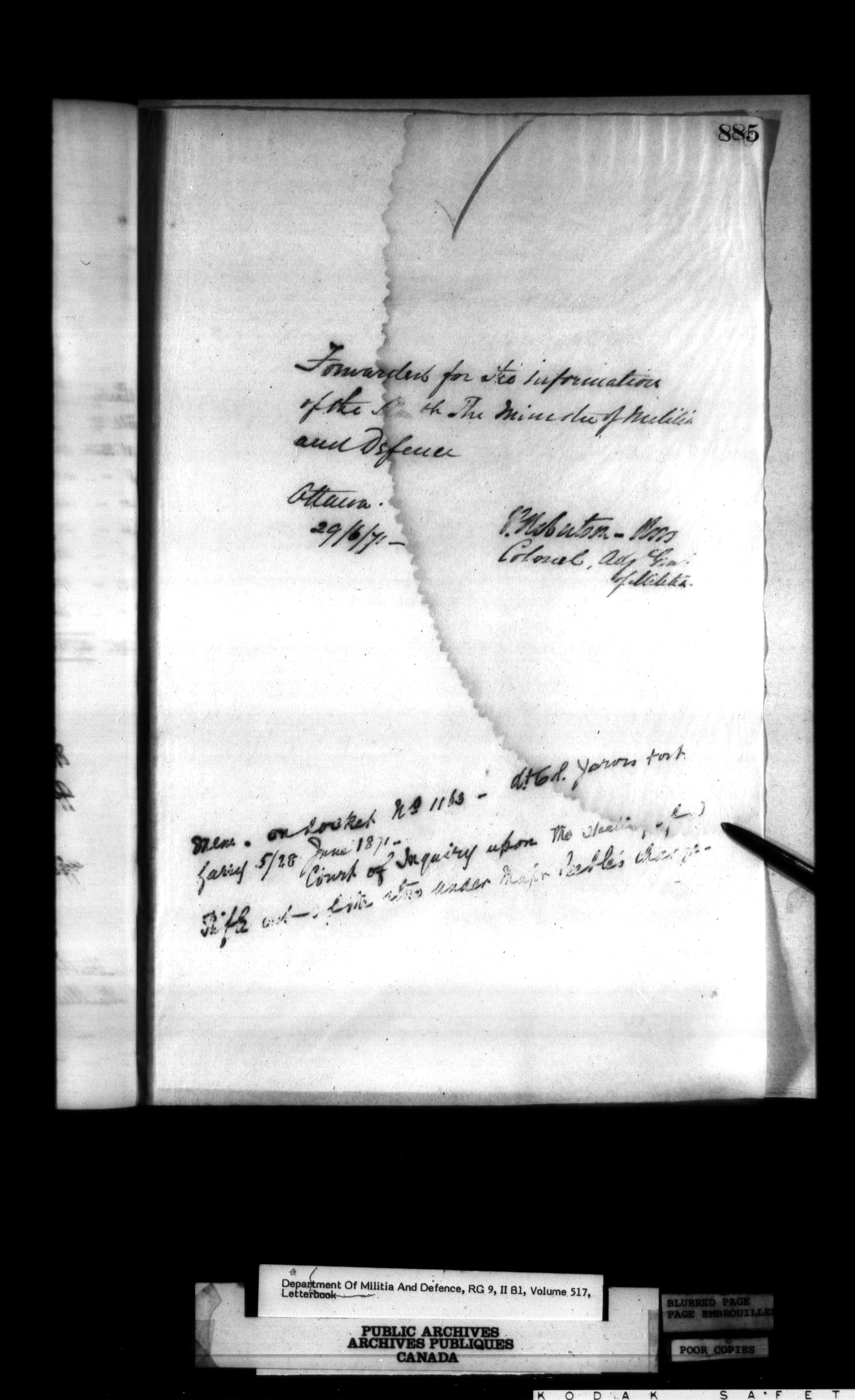 Correspondence of the General Officer Commanding (GOC) of the Canadian Militia and his predecessor, the Adjutant General - 285