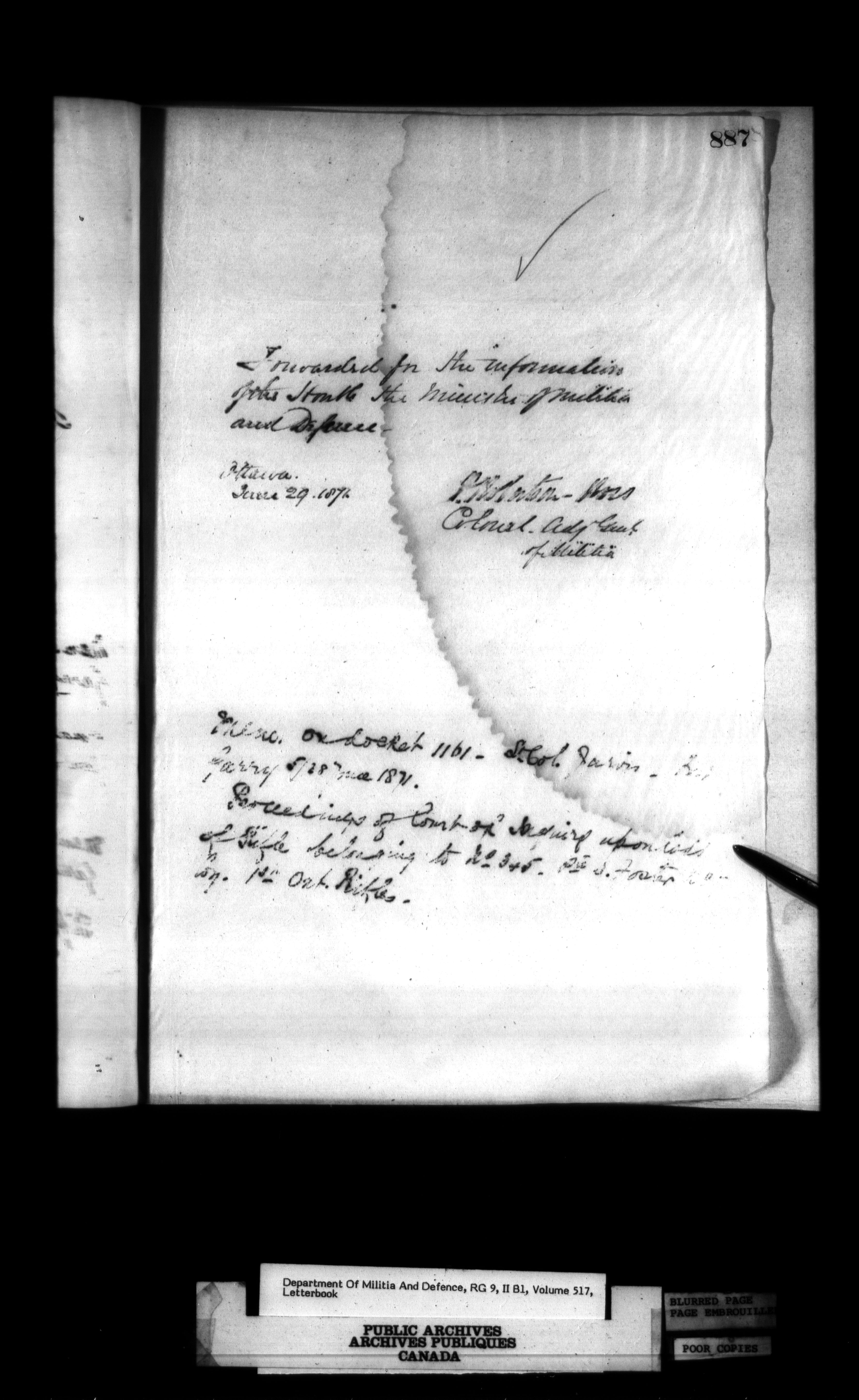Correspondence of the General Officer Commanding (GOC) of the Canadian Militia and his predecessor, the Adjutant General - 285
