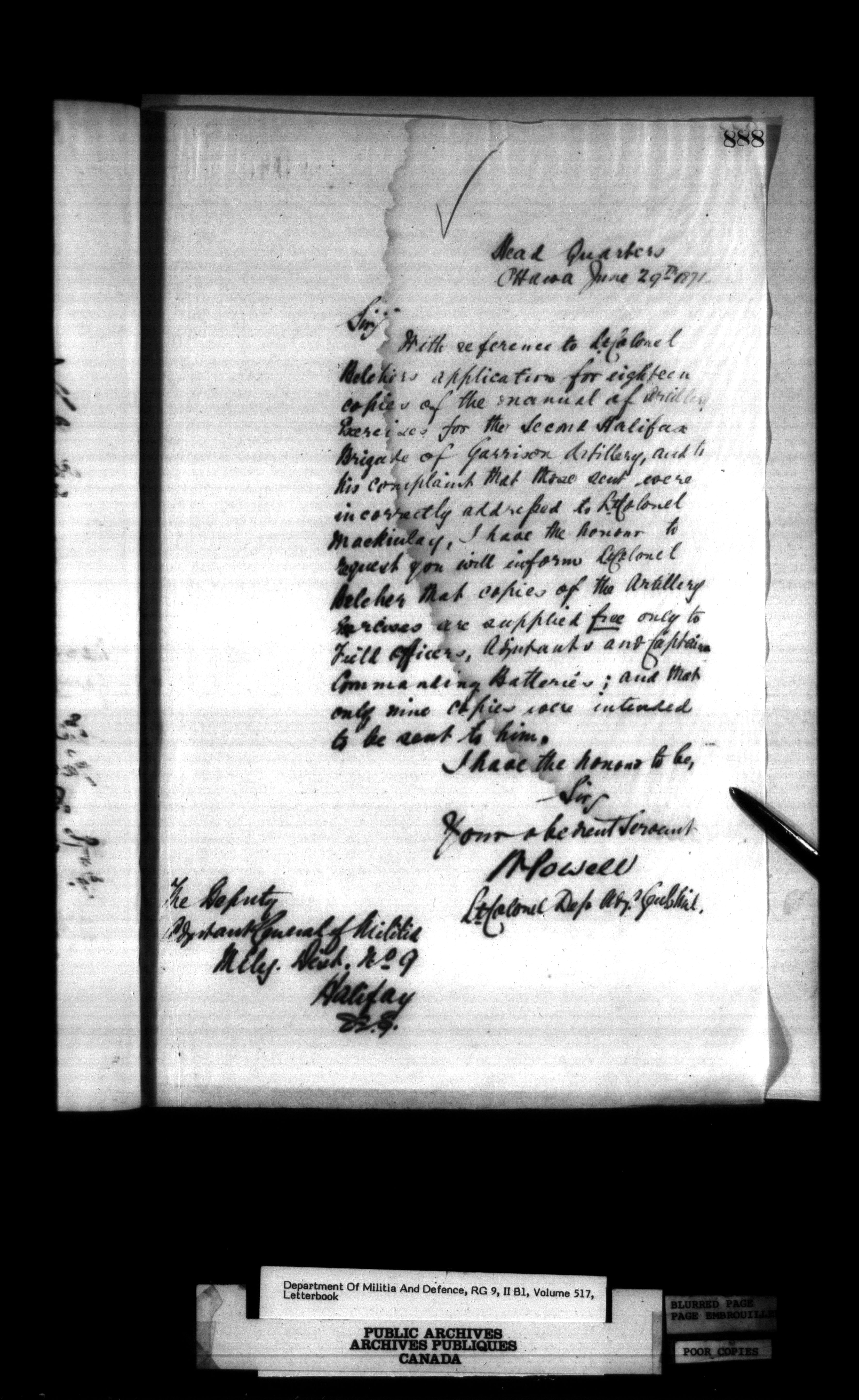 Correspondence of the General Officer Commanding (GOC) of the Canadian Militia and his predecessor, the Adjutant General - 285