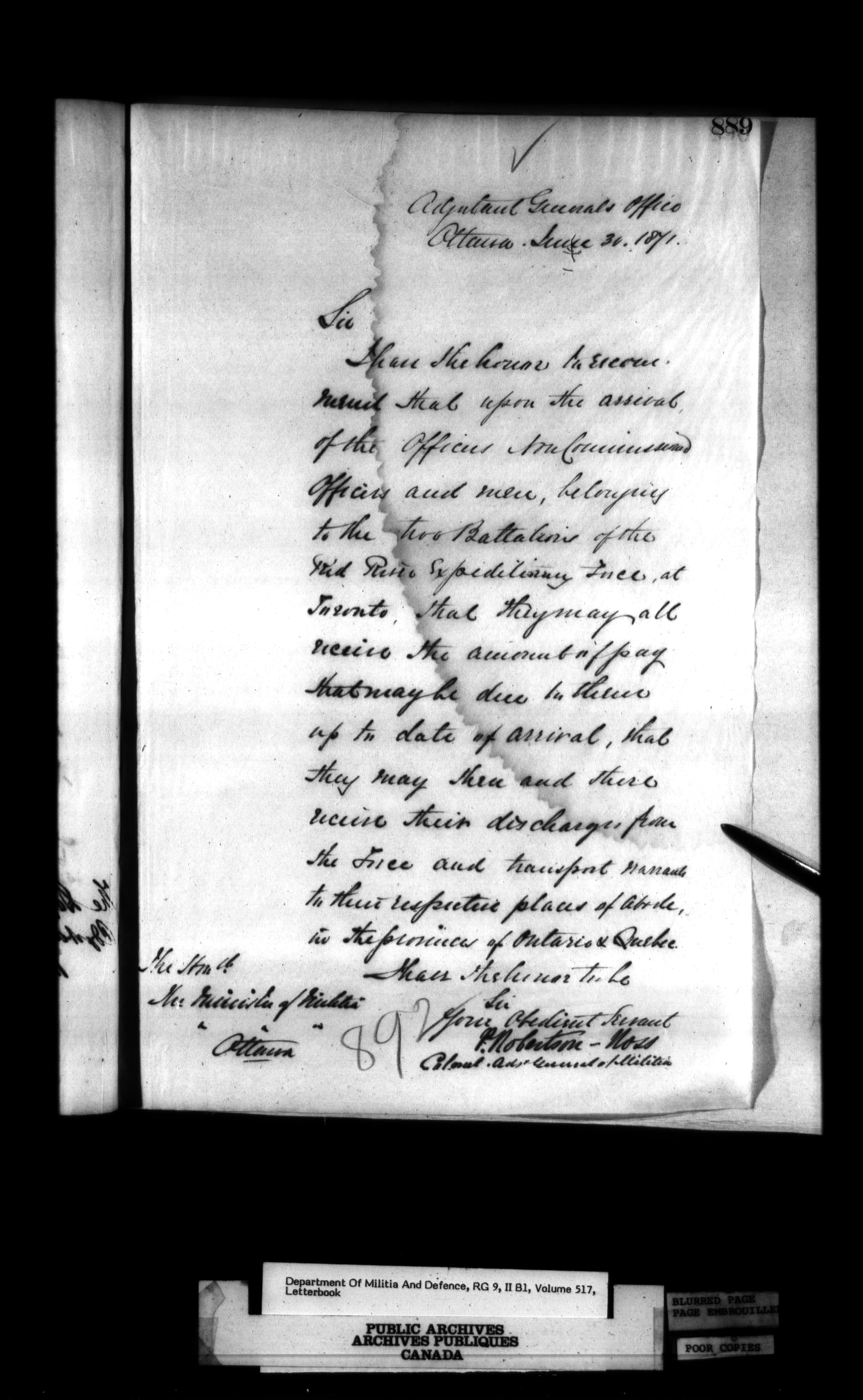 Correspondence of the General Officer Commanding (GOC) of the Canadian Militia and his predecessor, the Adjutant General - 285