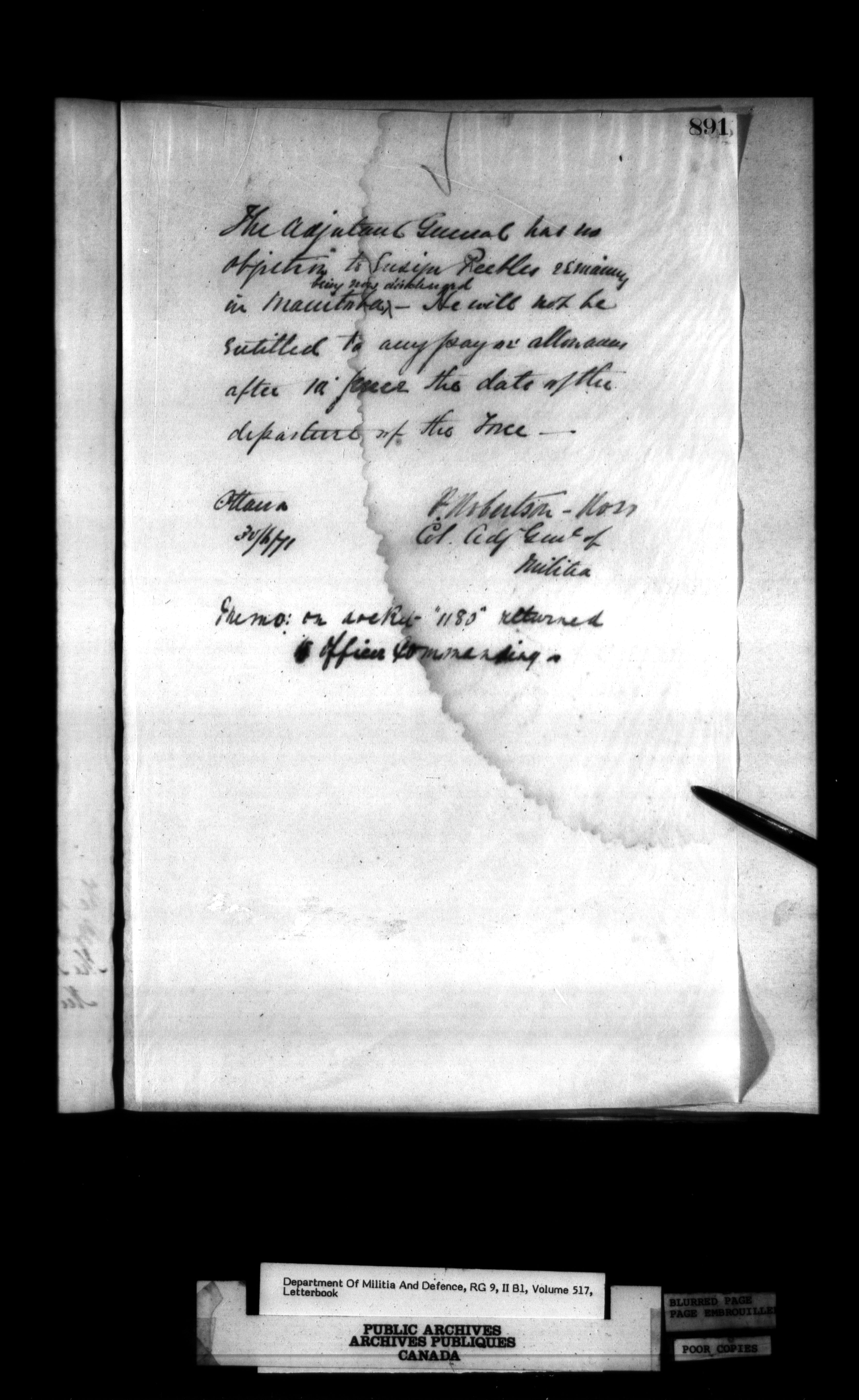 Correspondence of the General Officer Commanding (GOC) of the Canadian Militia and his predecessor, the Adjutant General - 285