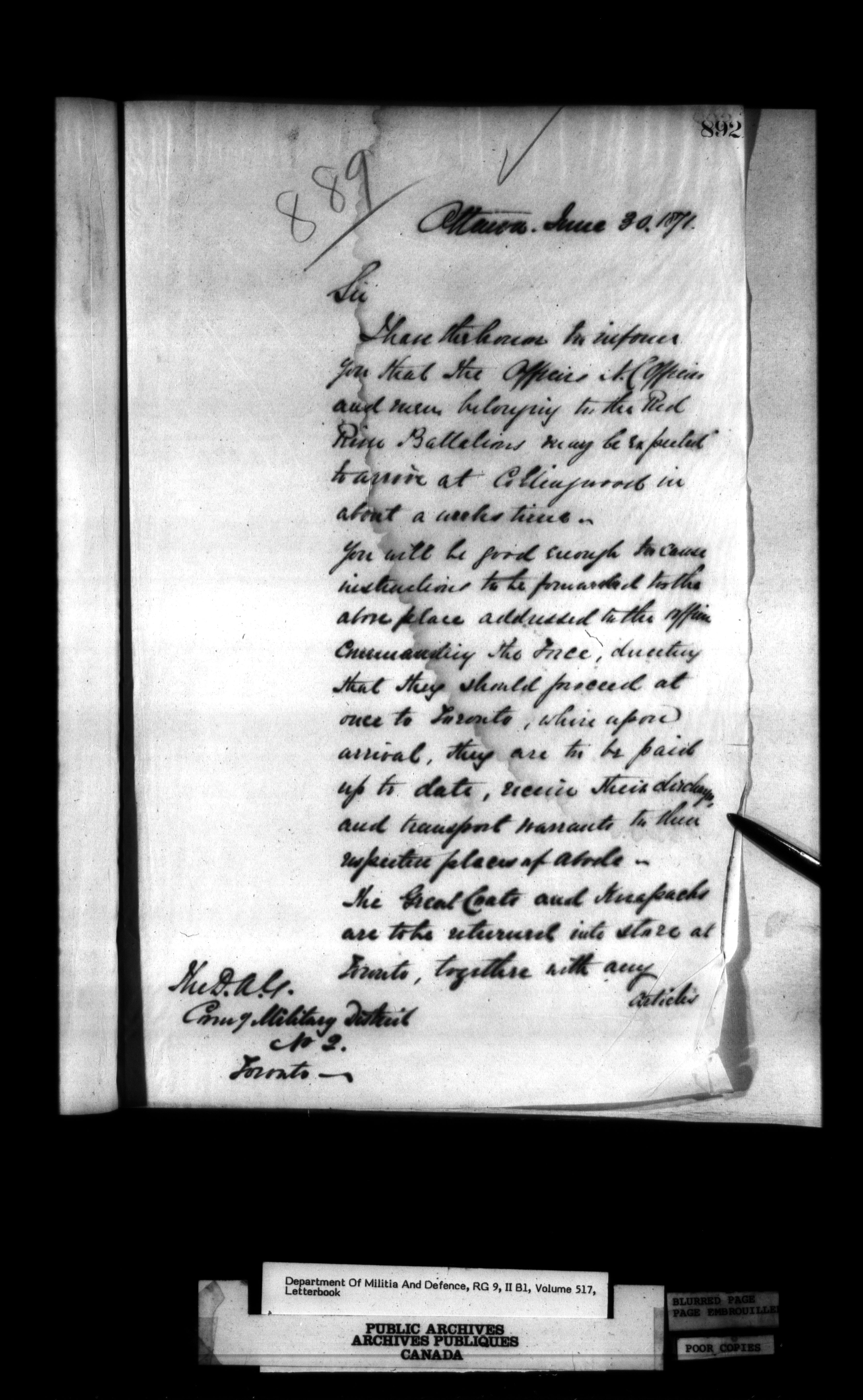 Correspondence of the General Officer Commanding (GOC) of the Canadian Militia and his predecessor, the Adjutant General - 285
