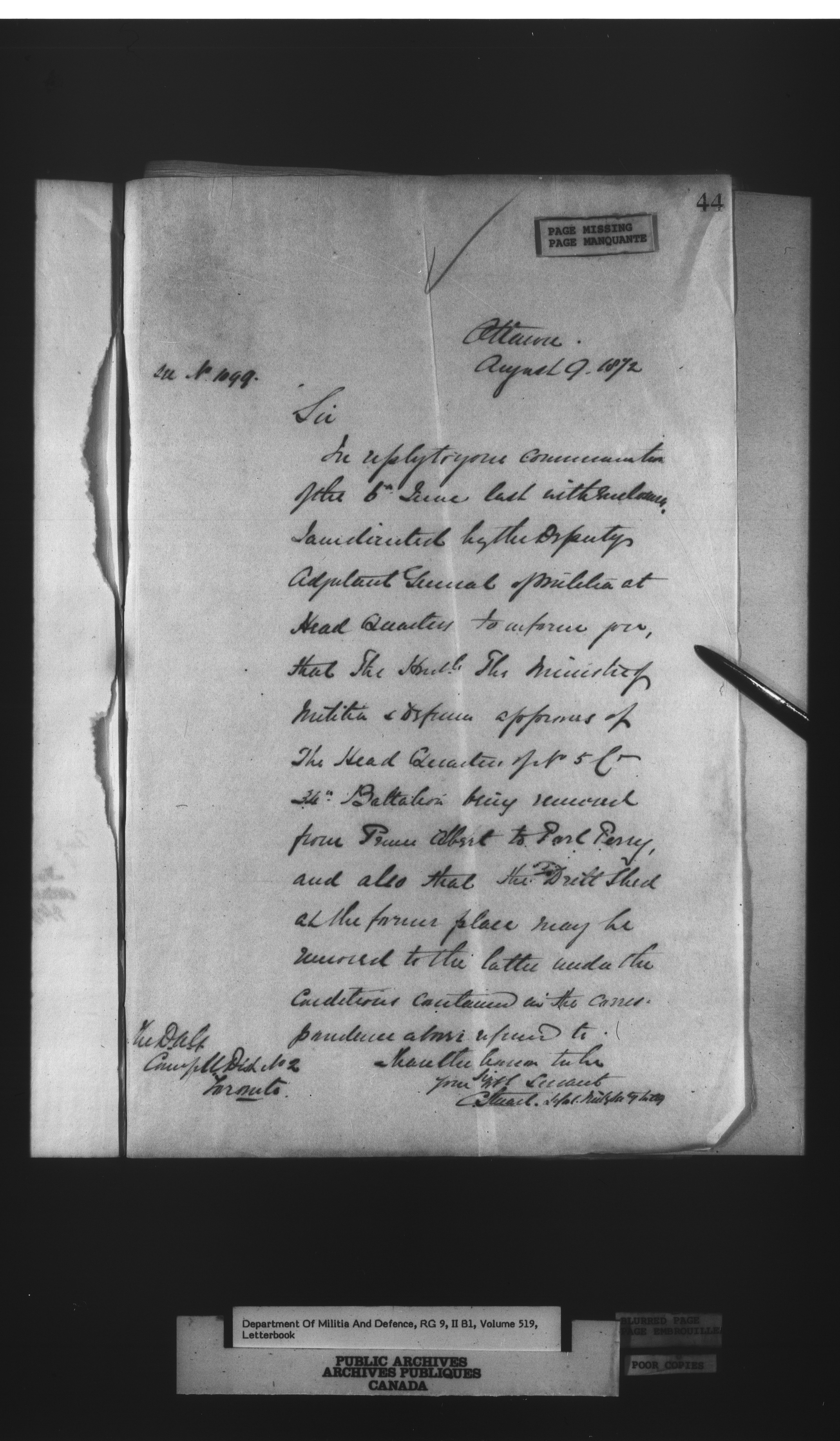 Correspondence of the General Officer Commanding (GOC) of the Canadian Militia and his predecessor, the Adjutant General - 286