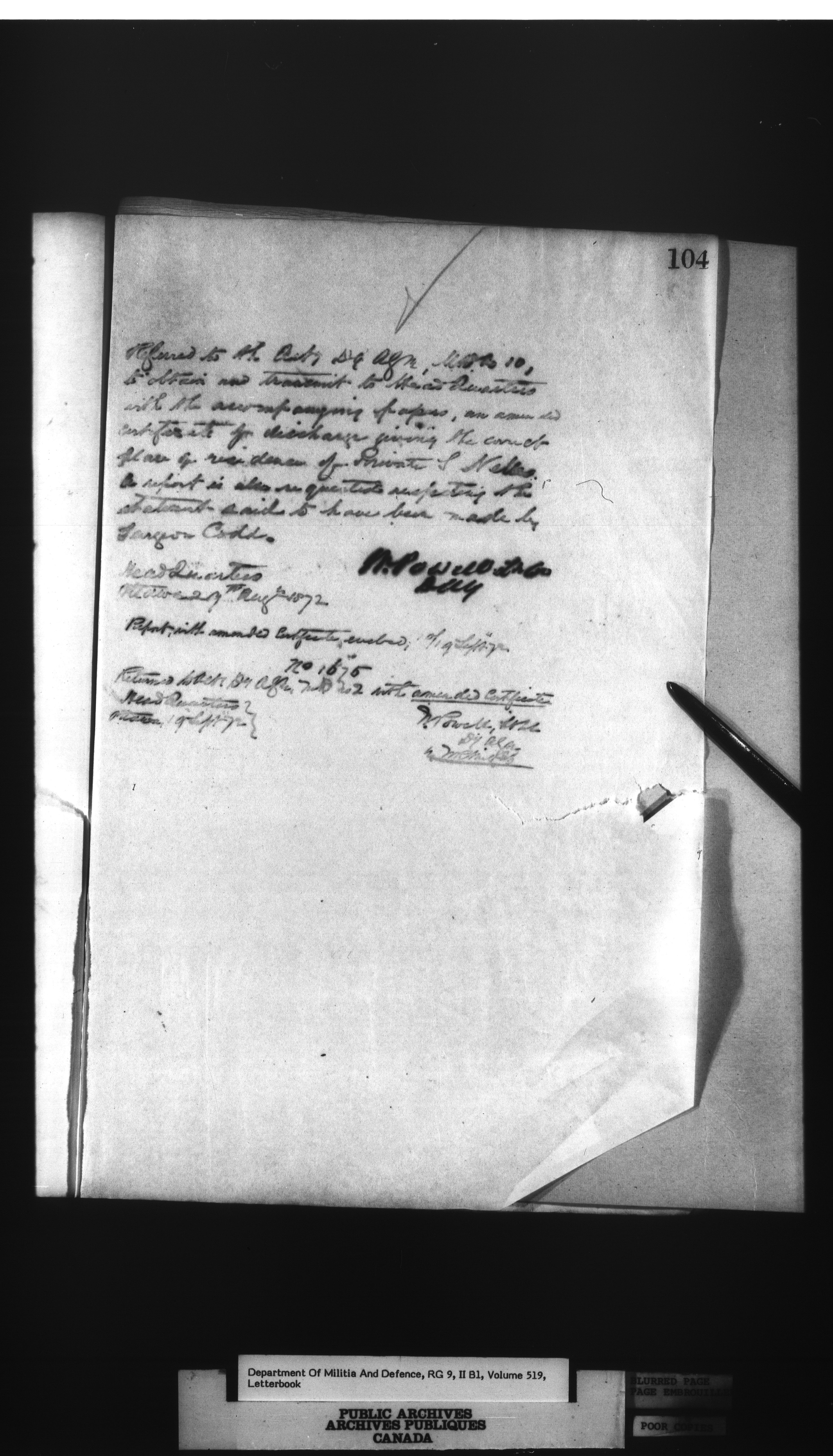 Correspondence of the General Officer Commanding (GOC) of the Canadian Militia and his predecessor, the Adjutant General - 287