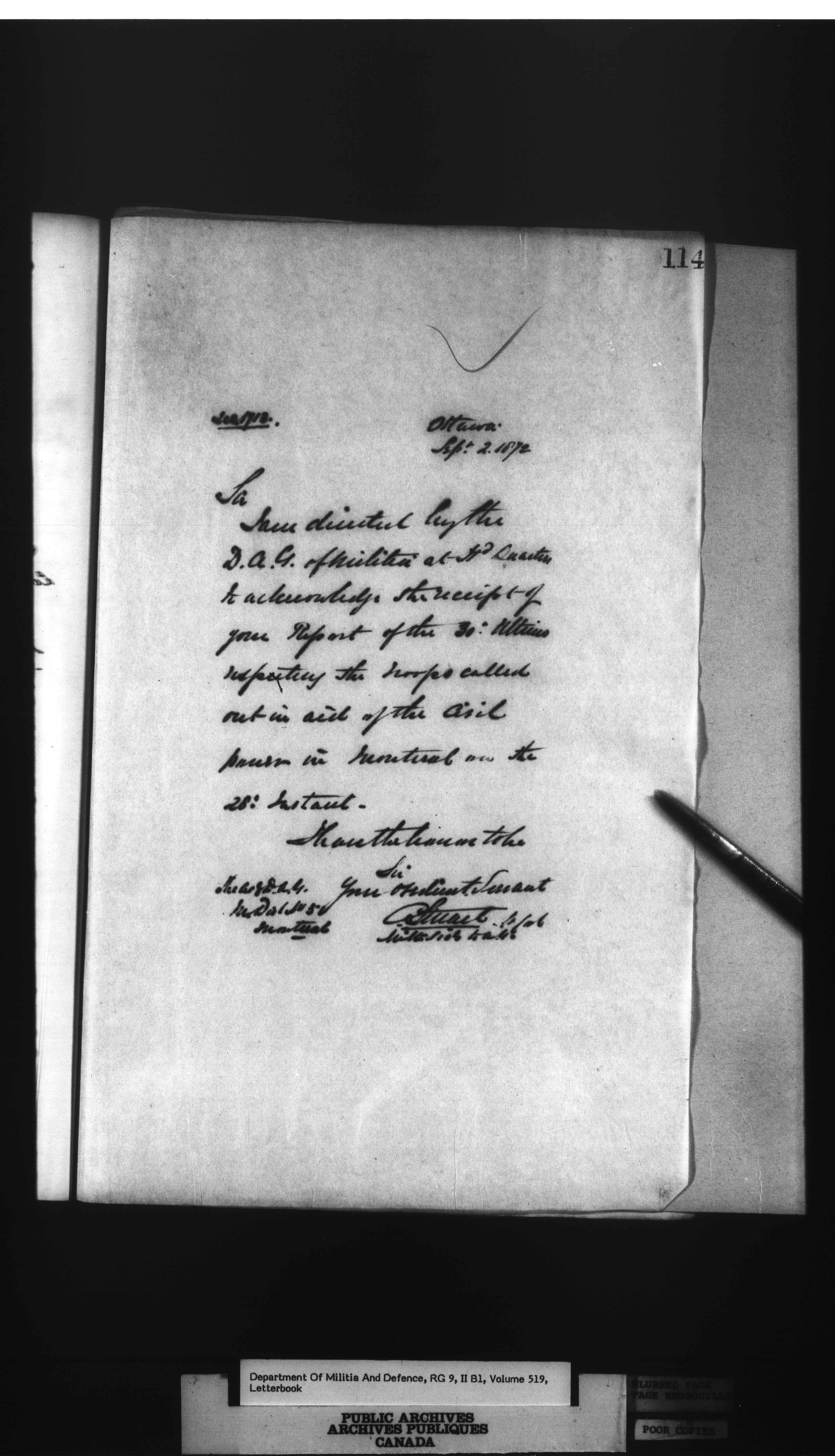 Correspondence of the General Officer Commanding (GOC) of the Canadian Militia and his predecessor, the Adjutant General - 287