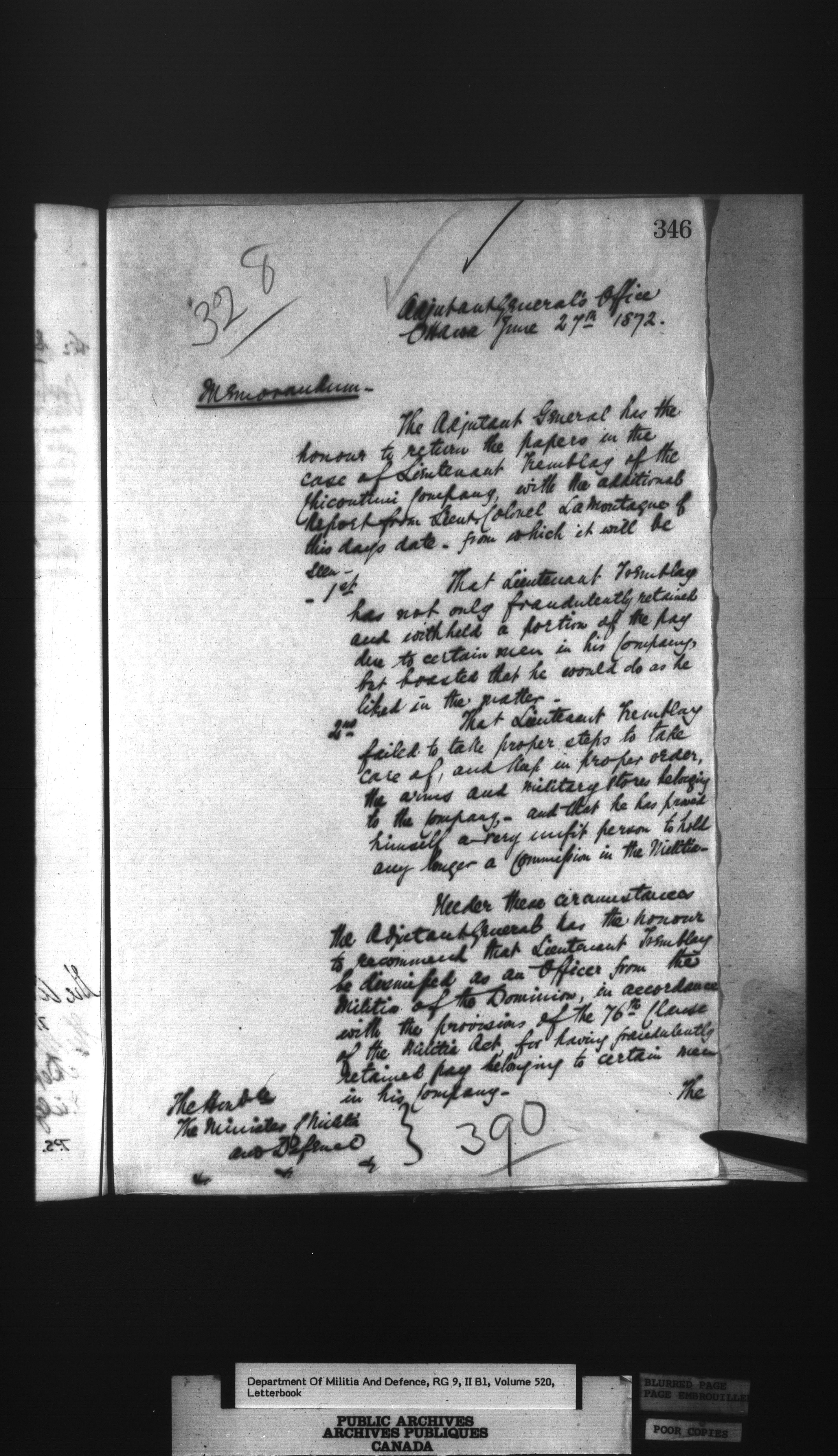 Correspondence of the General Officer Commanding (GOC) of the Canadian Militia and his predecessor, the Adjutant General - 288