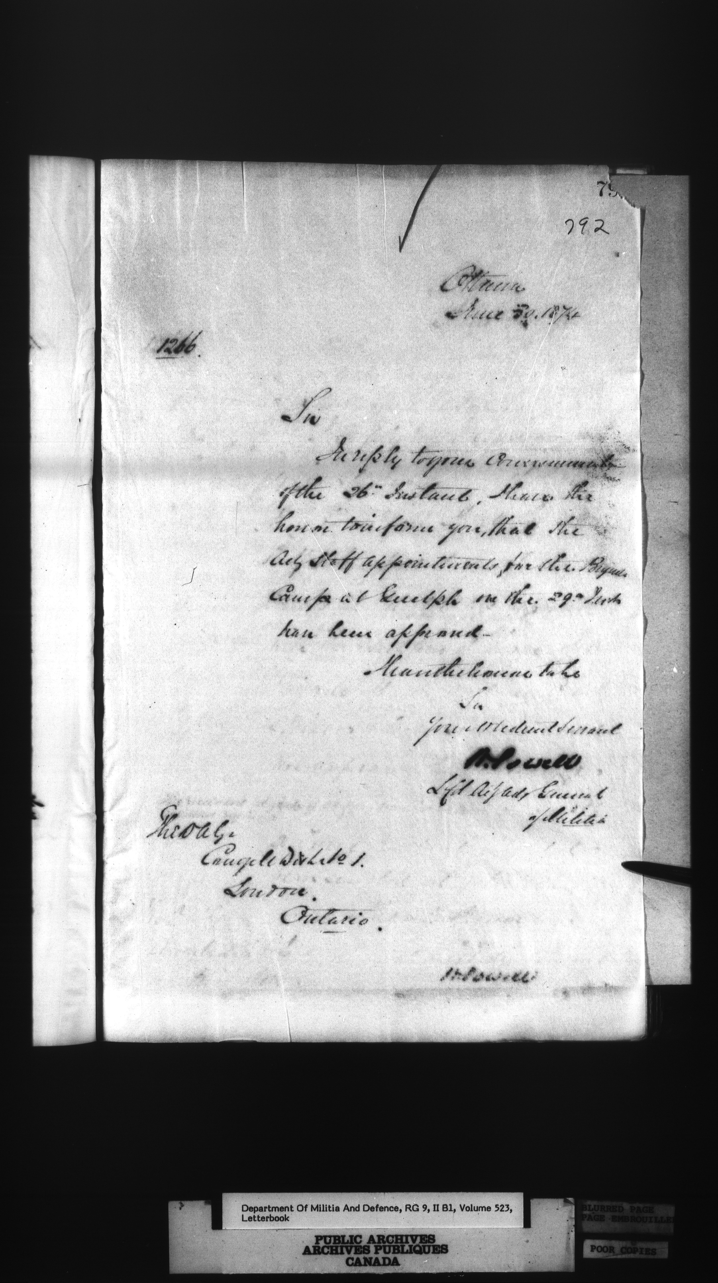 Correspondence of the General Officer Commanding (GOC) of the Canadian Militia and his predecessor, the Adjutant General - 290