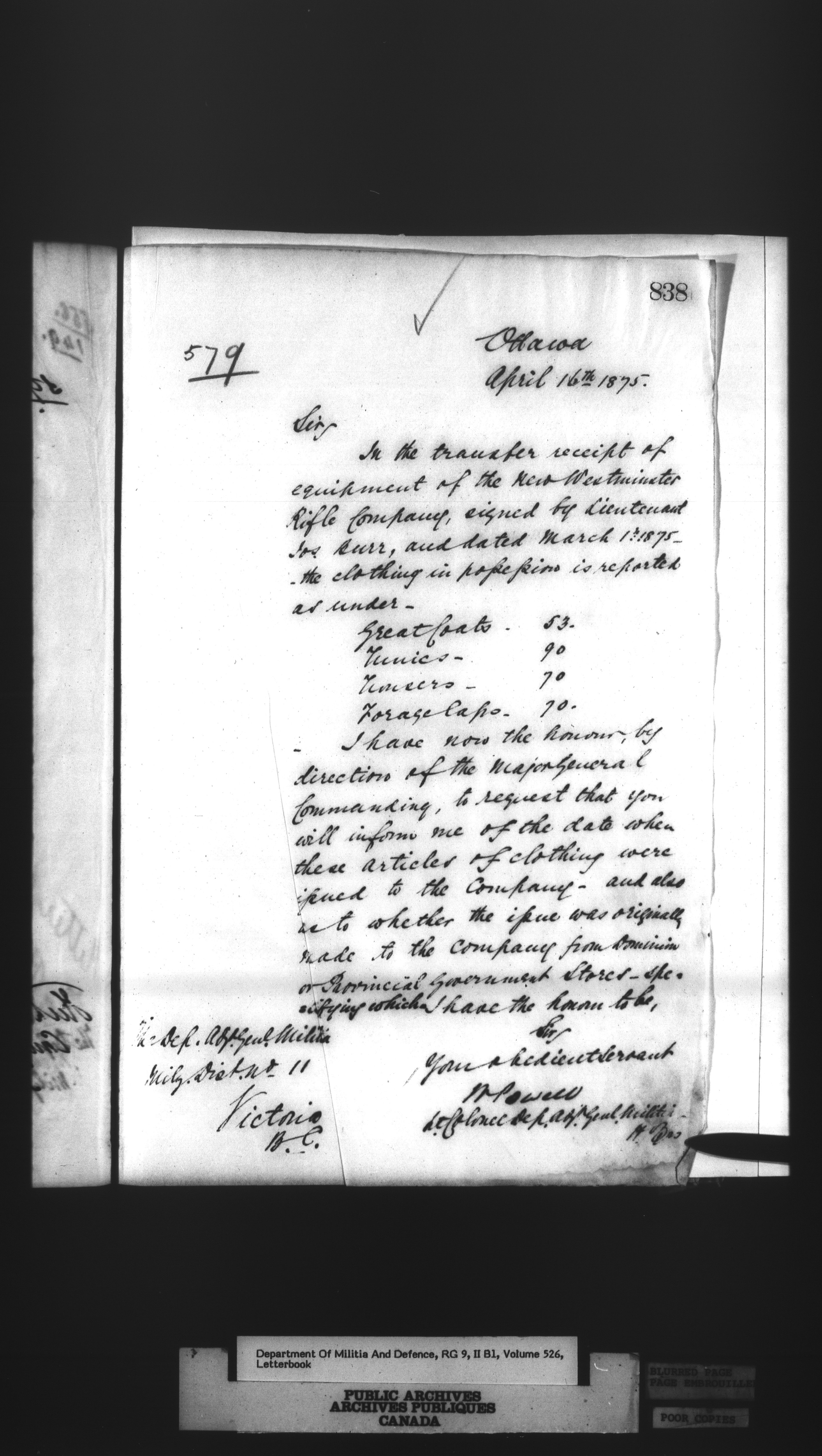 Correspondence of the General Officer Commanding (GOC) of the Canadian Militia and his predecessor, the Adjutant General - 292