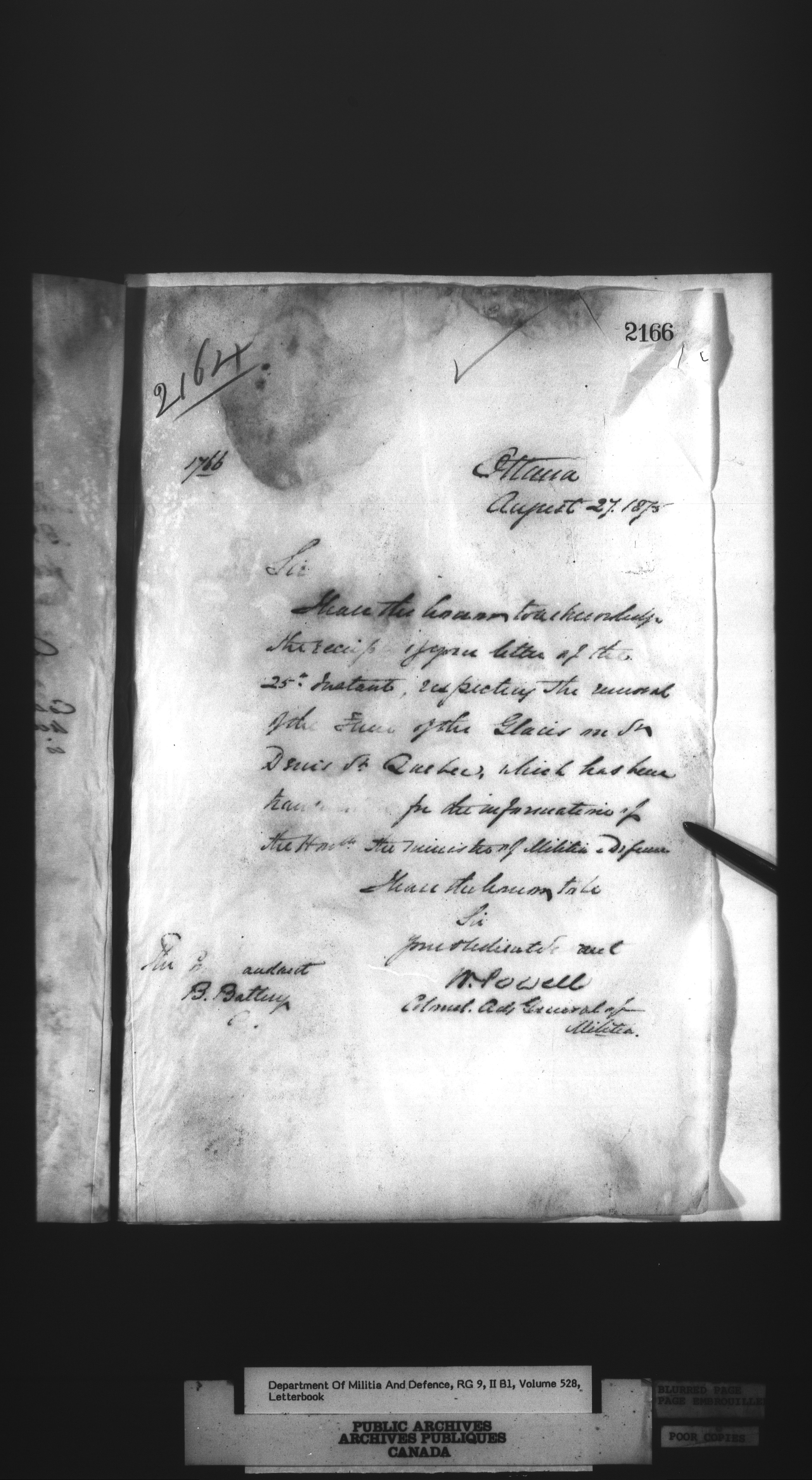 Correspondence of the General Officer Commanding (GOC) of the Canadian Militia and his predecessor, the Adjutant General - 293