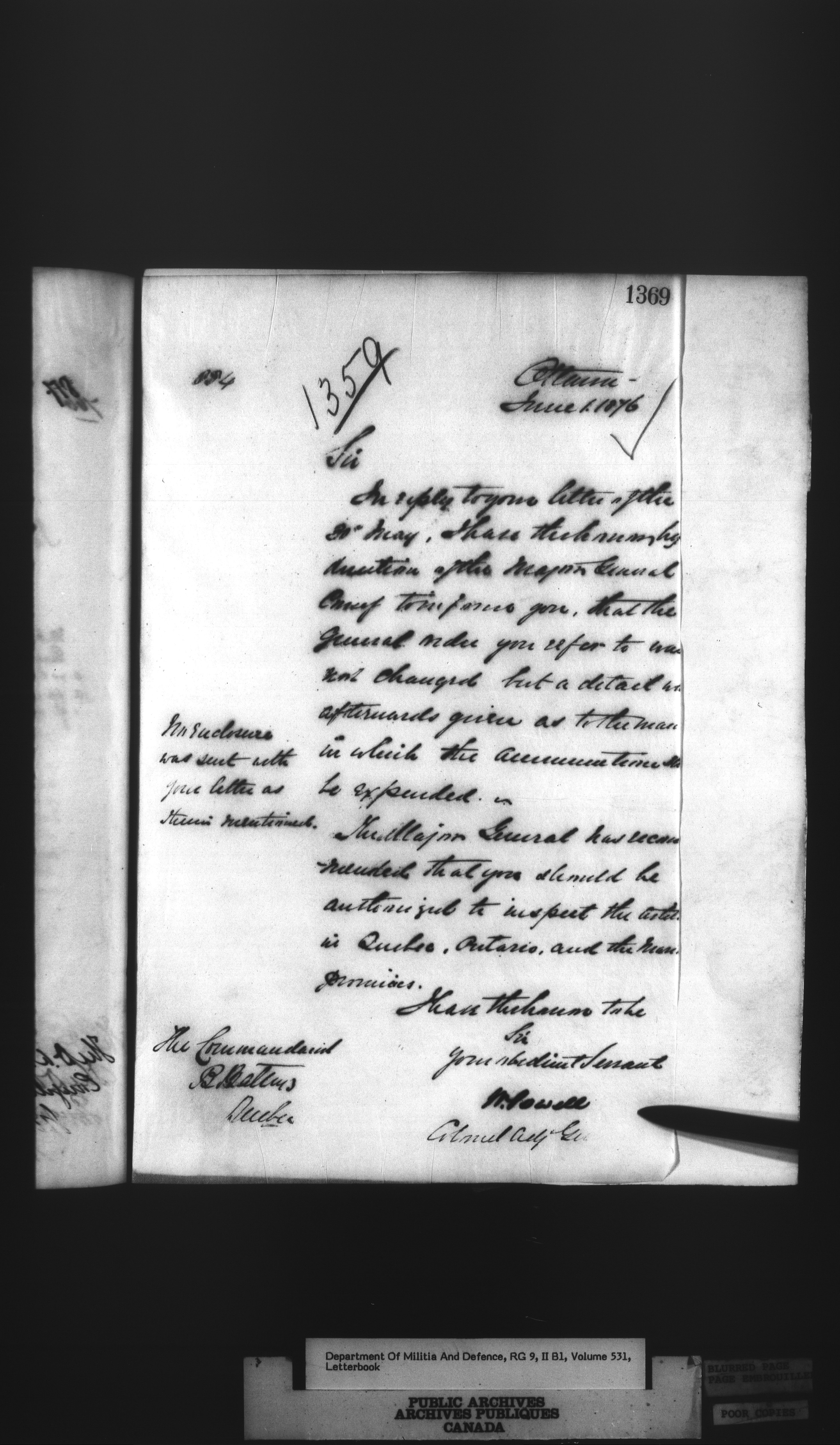 Correspondence of the General Officer Commanding (GOC) of the Canadian Militia and his predecessor, the Adjutant General - 295
