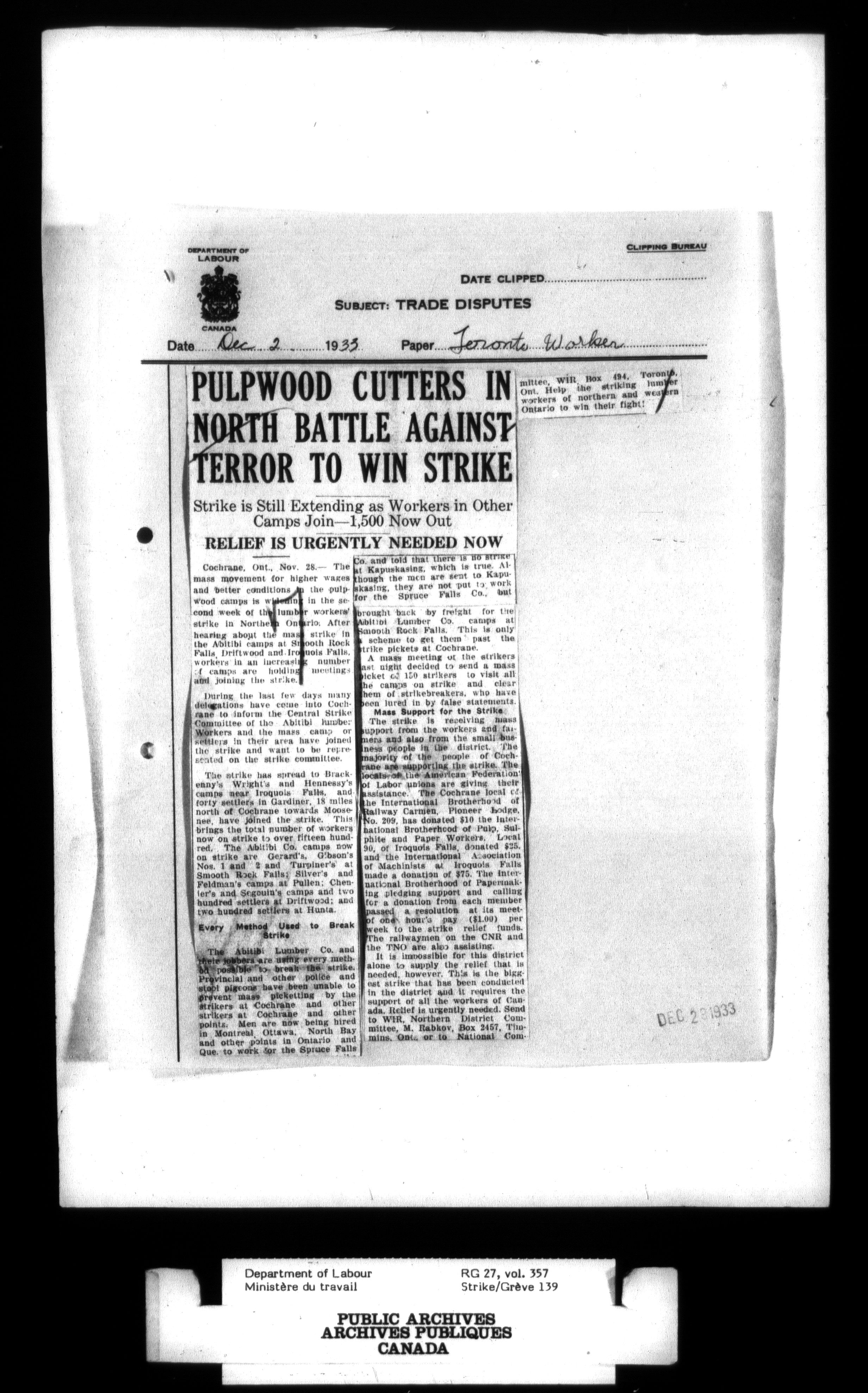 Department of Labour, Economics and Research Branch : Strikes and lockout files : T-2968