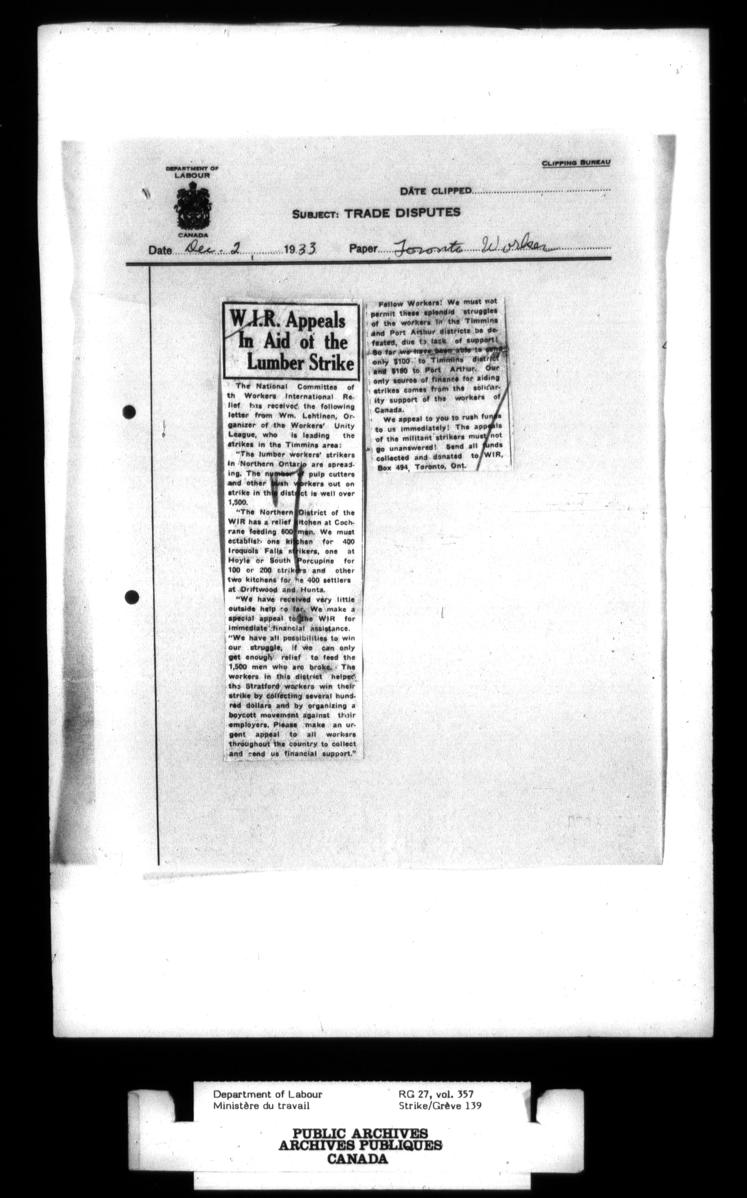 Department of Labour, Economics and Research Branch : Strikes and lockout files : T-2968