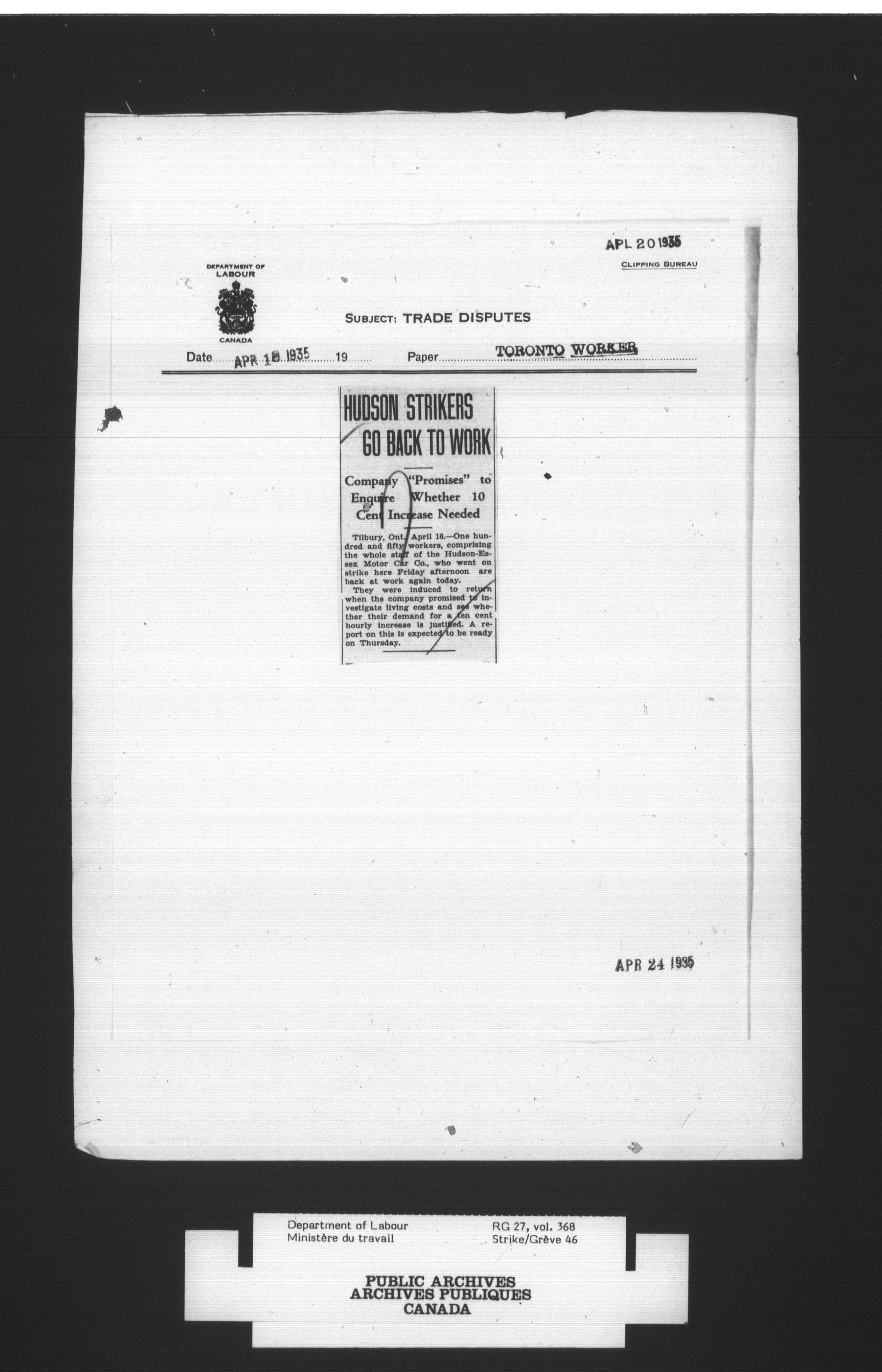 Department of Labour, Economics and Research Branch : Strikes and lockout files - 2977