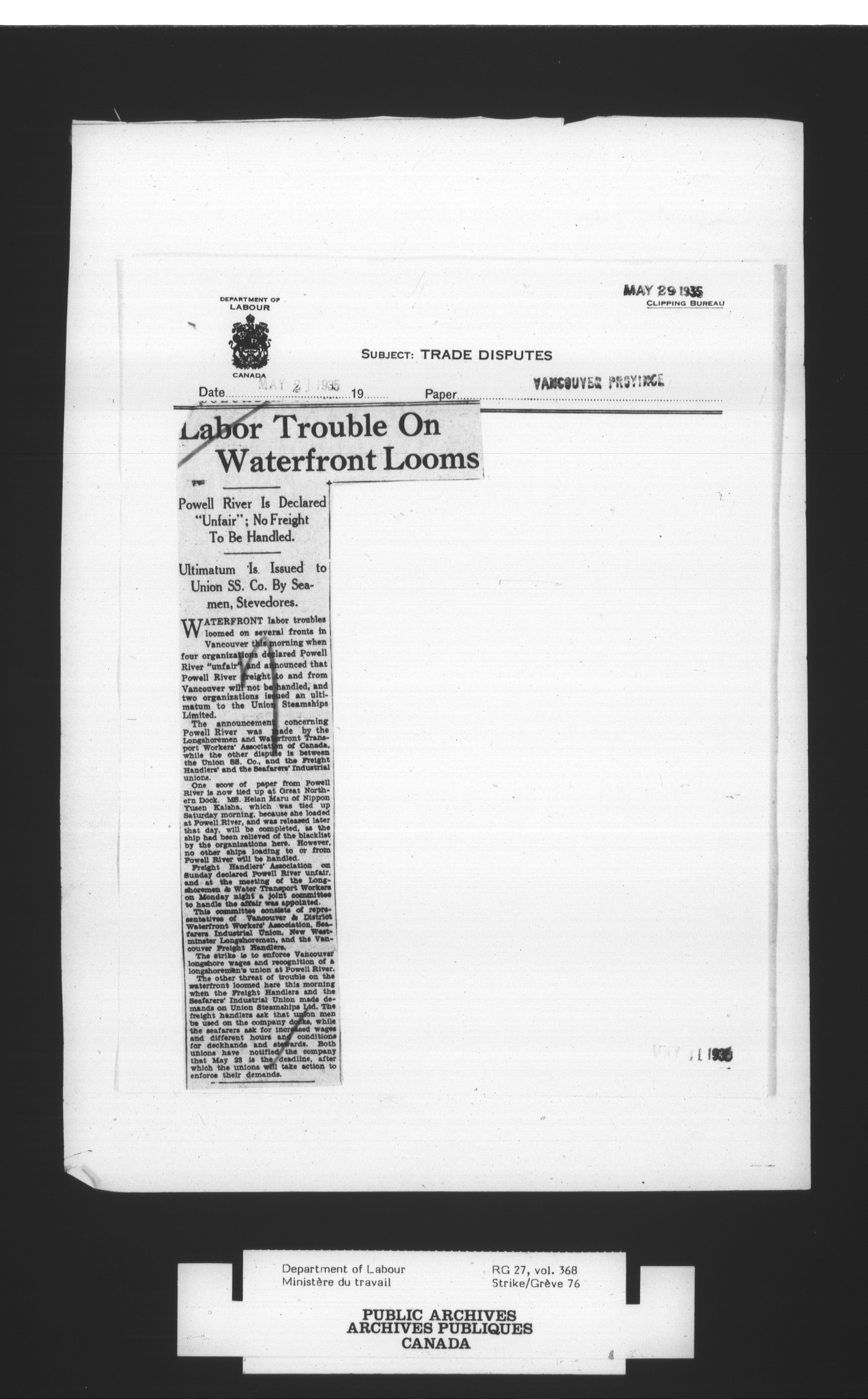 Department of Labour, Economics and Research Branch : Strikes and lockout files : T-2978