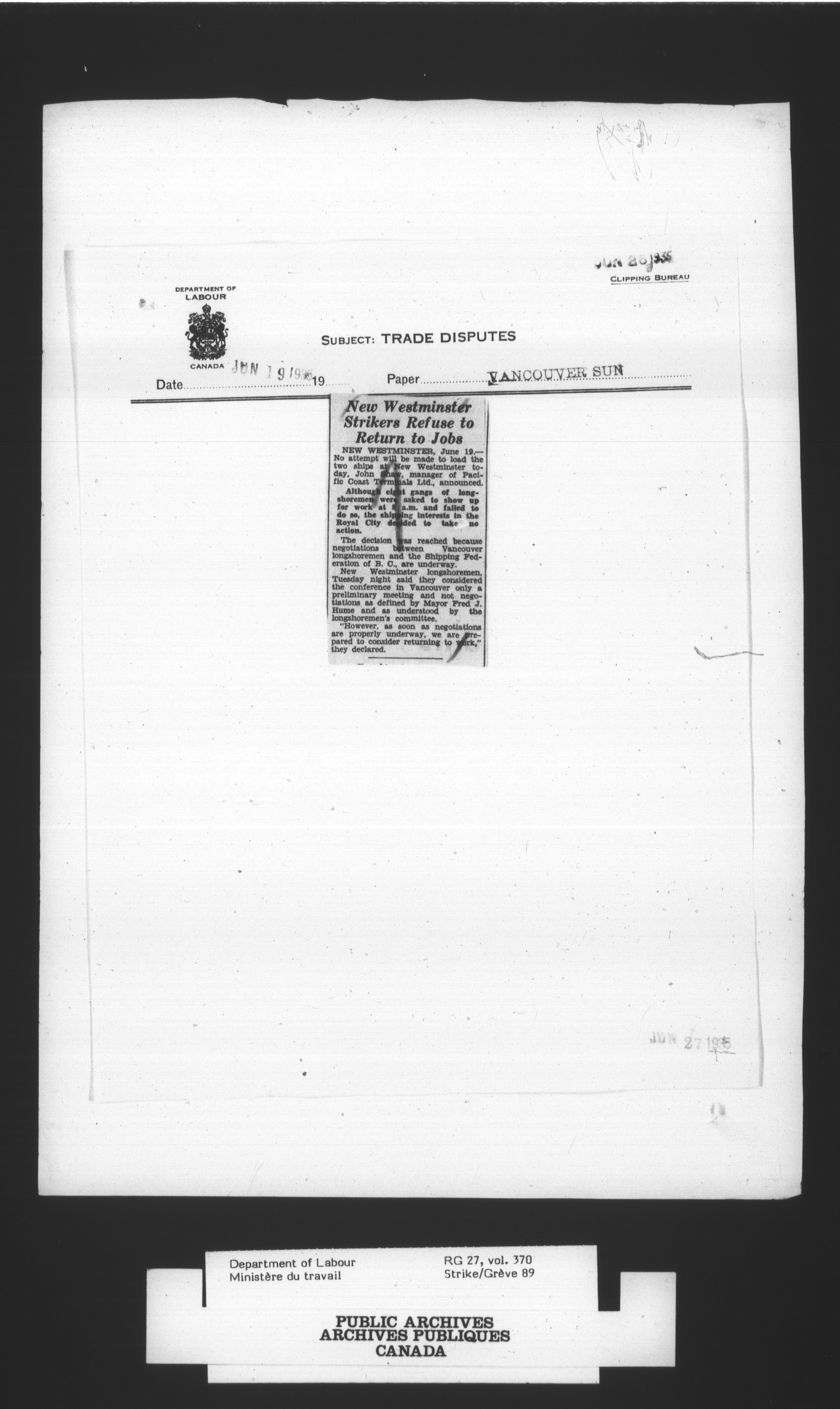 Department of Labour, Economics and Research Branch : Strikes and lockout files - 2980