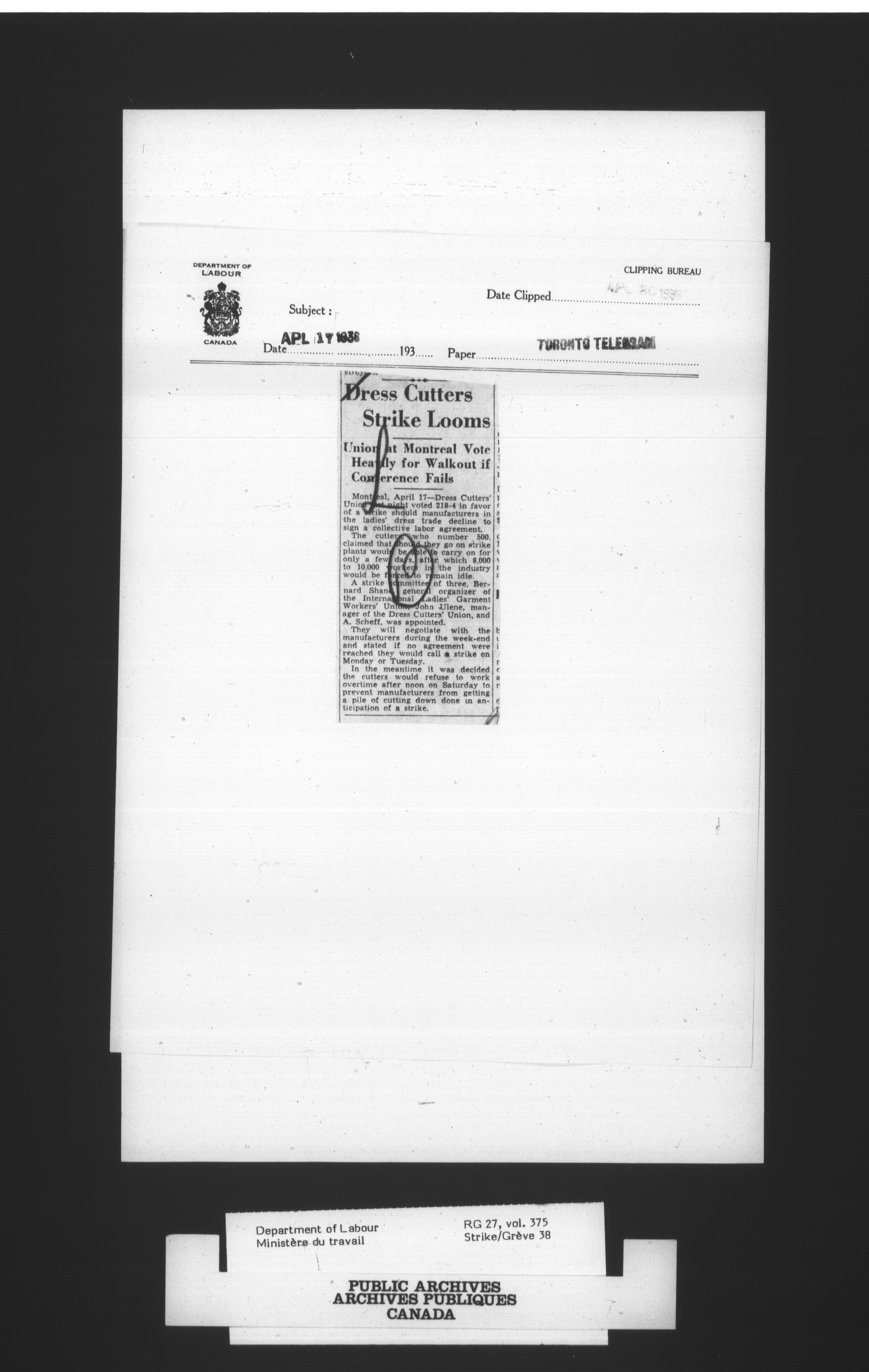 Department of Labour, Economics and Research Branch : Strikes and lockout files - 2985