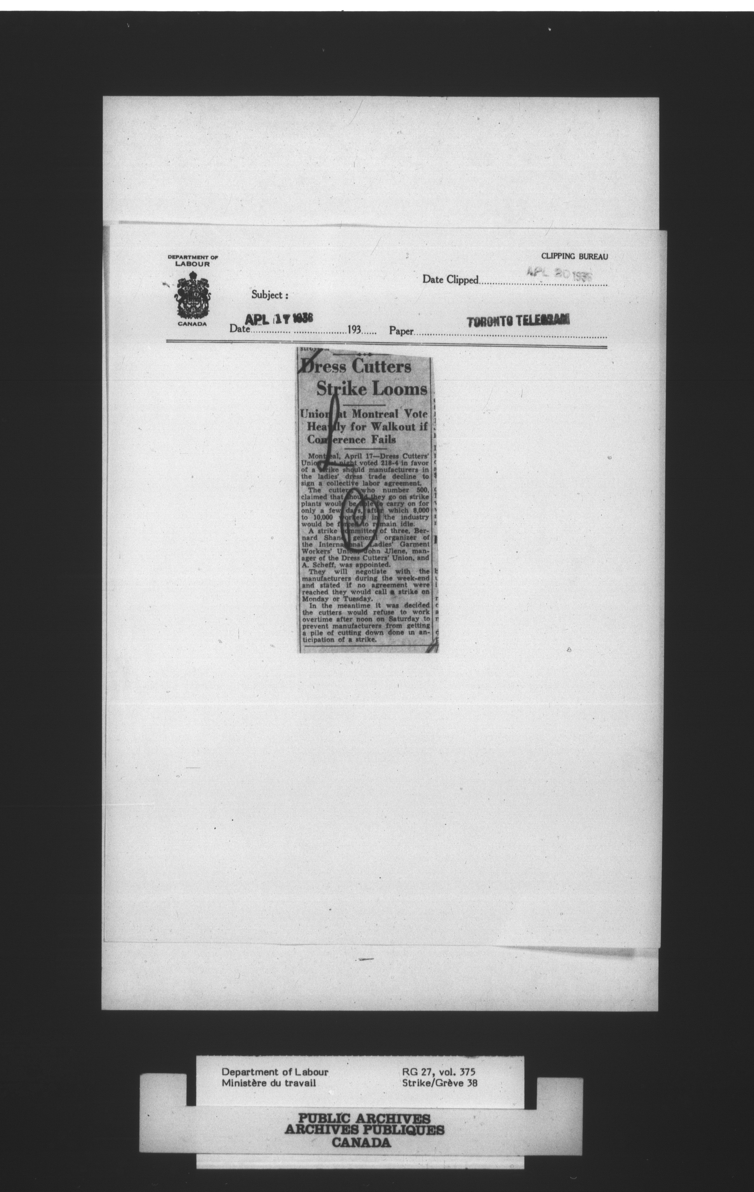 Department of Labour, Economics and Research Branch : Strikes and lockout files : T-2985
