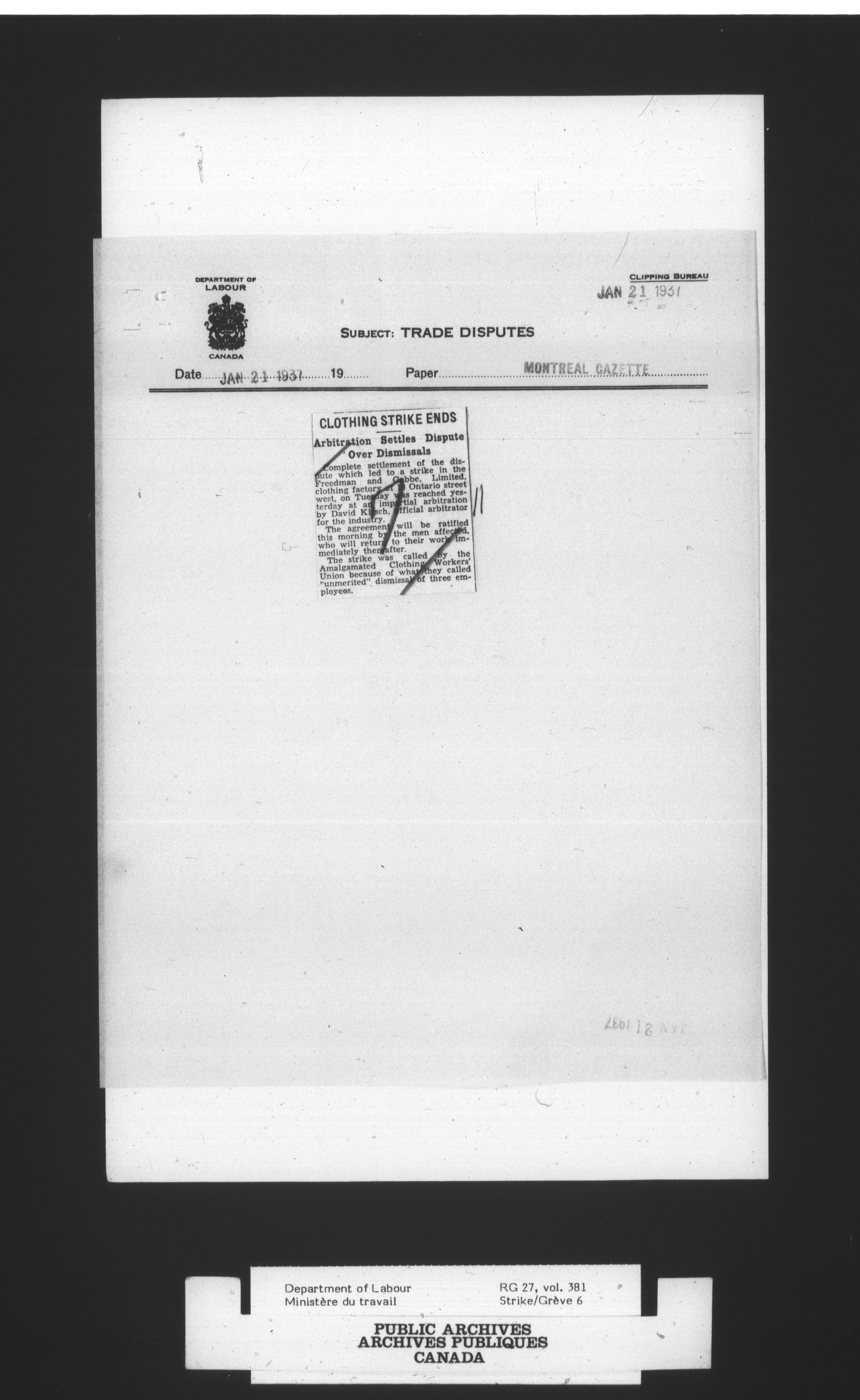 Department of Labour, Economics and Research Branch : Strikes and lockout files - 2989