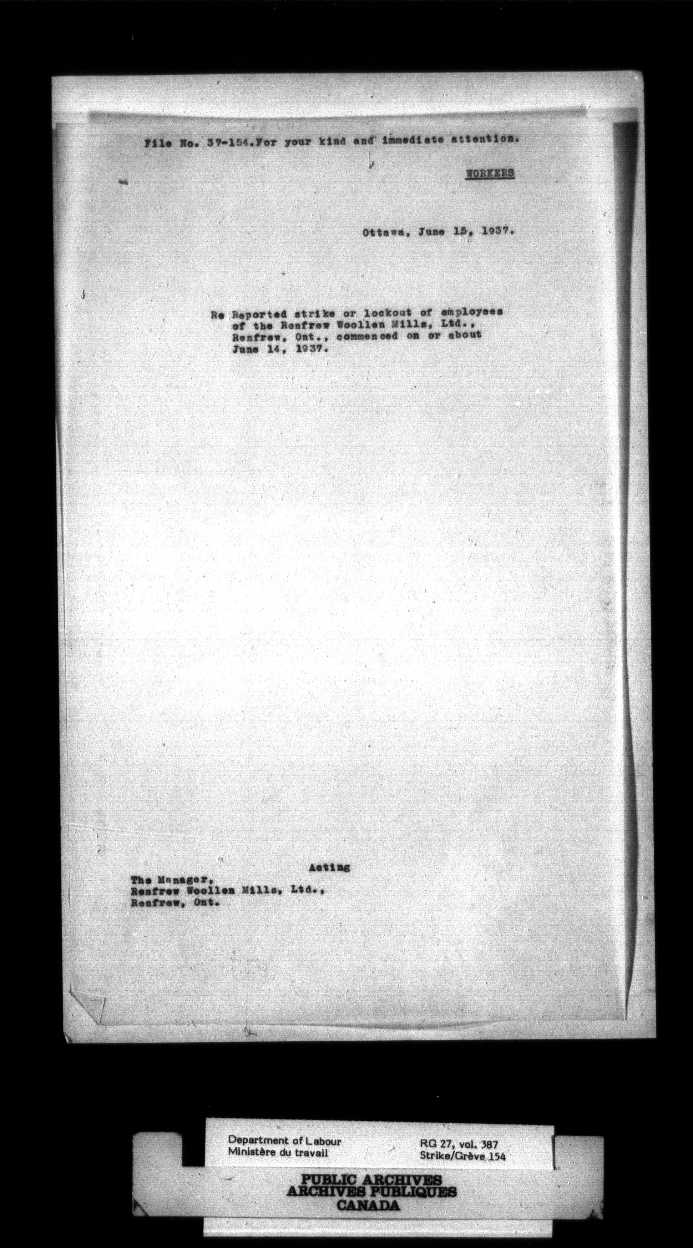 Department of Labour, Economics and Research Branch : Strikes and lockout files - 2996