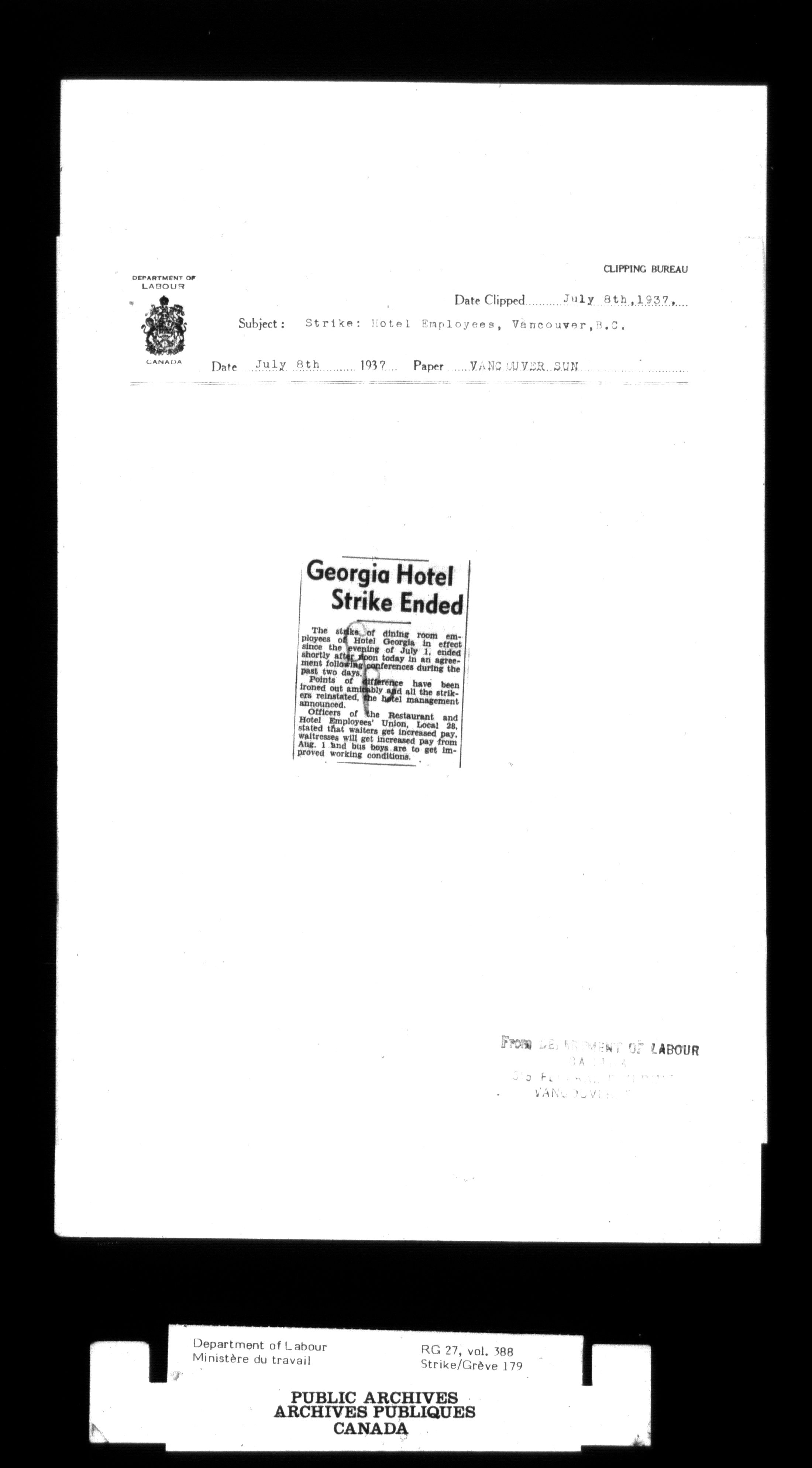 Department of Labour, Economics and Research Branch : Strikes and lockout files - 2997