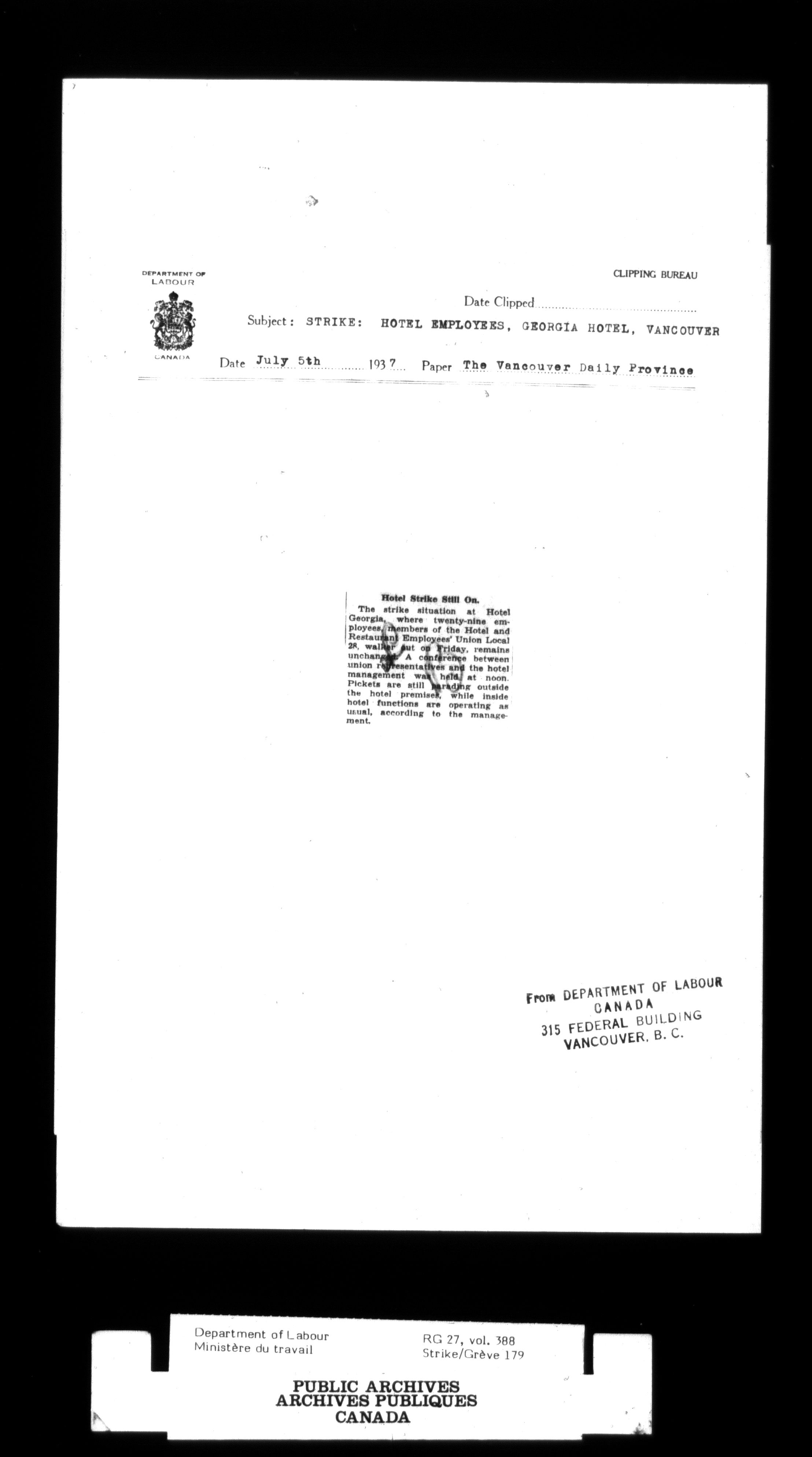 Department of Labour, Economics and Research Branch : Strikes and lockout files - 2997