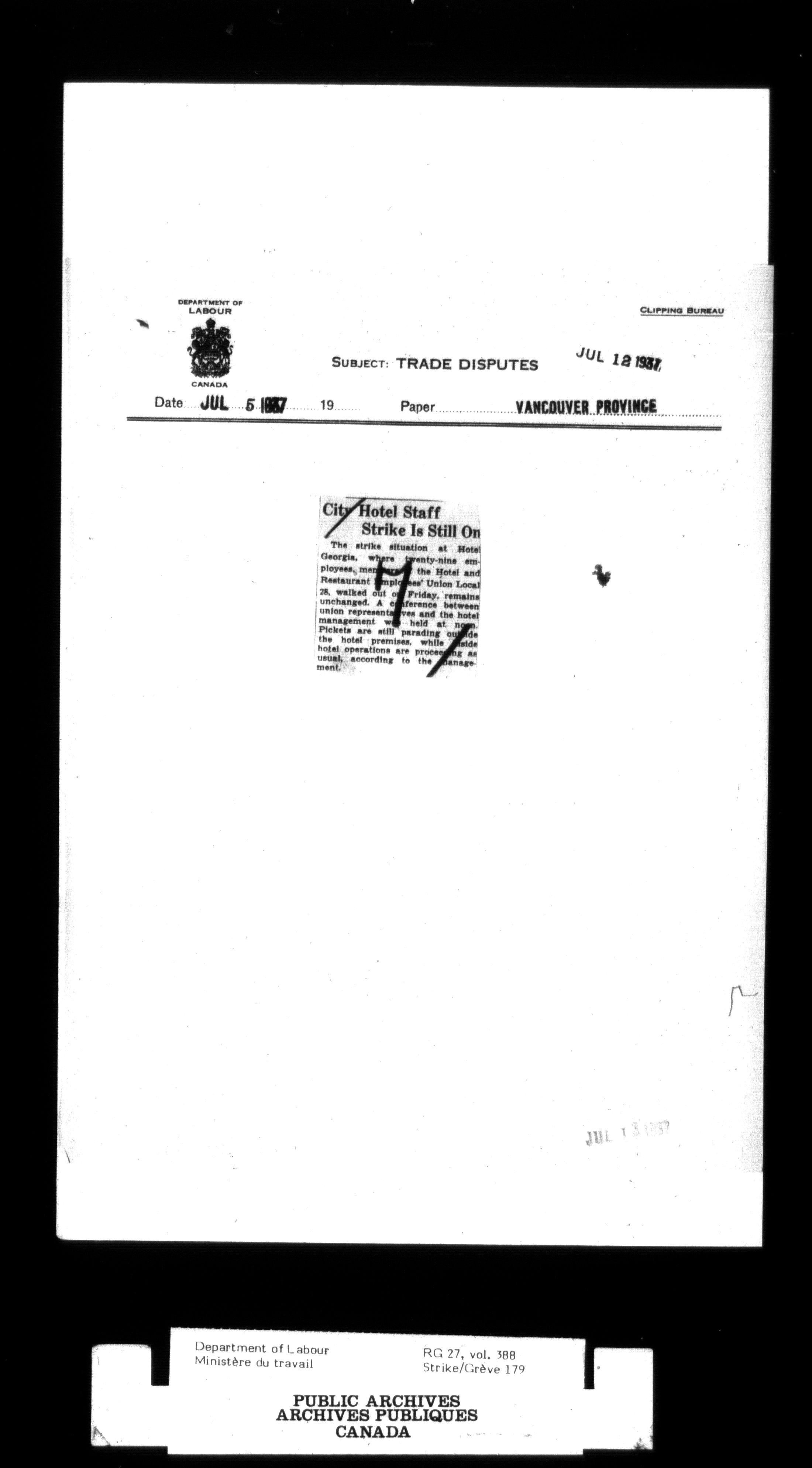 Department of Labour, Economics and Research Branch : Strikes and lockout files - 2997