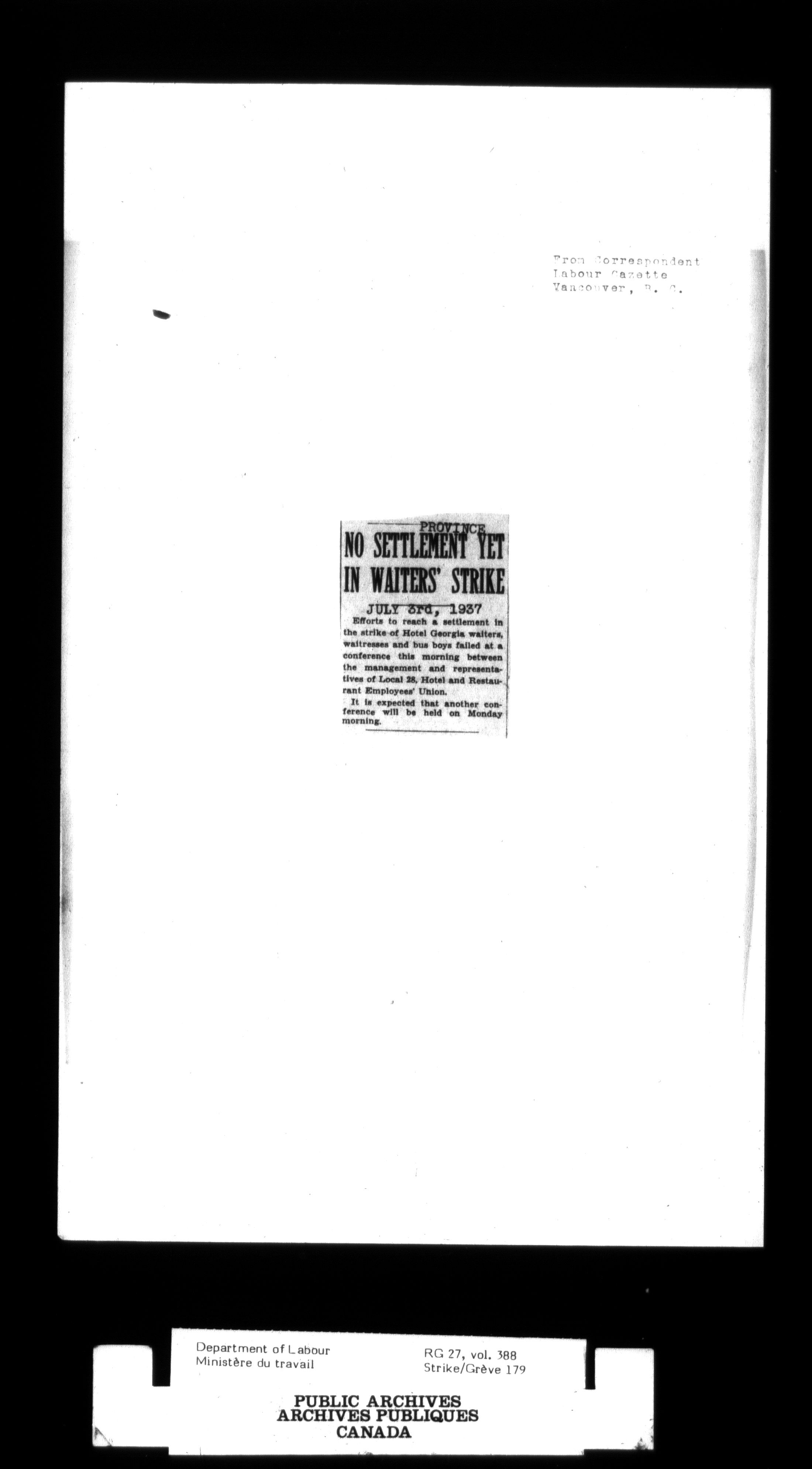 Department of Labour, Economics and Research Branch : Strikes and lockout files - 2997