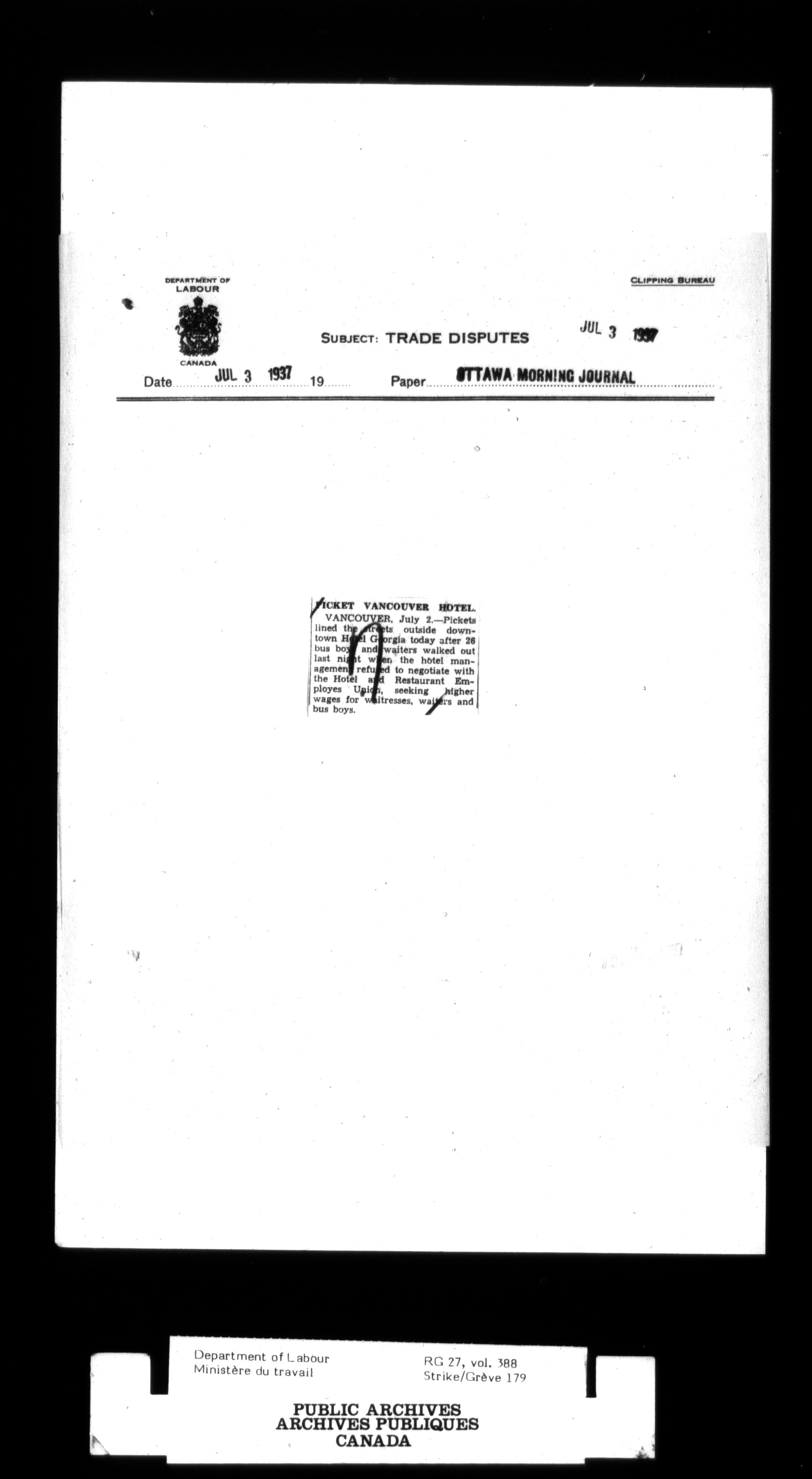 Department of Labour, Economics and Research Branch : Strikes and lockout files - 2997
