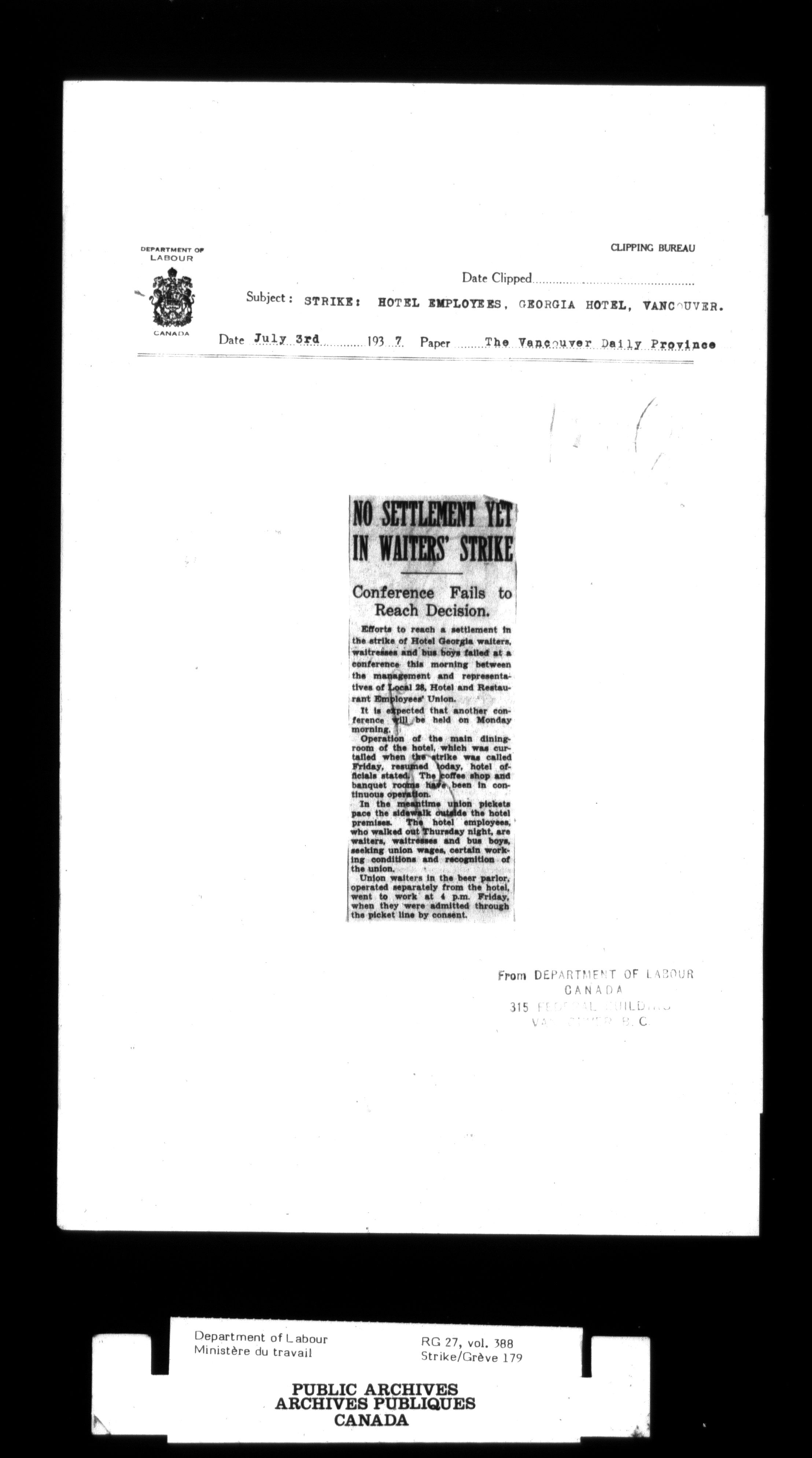Department of Labour, Economics and Research Branch : Strikes and lockout files - 2997