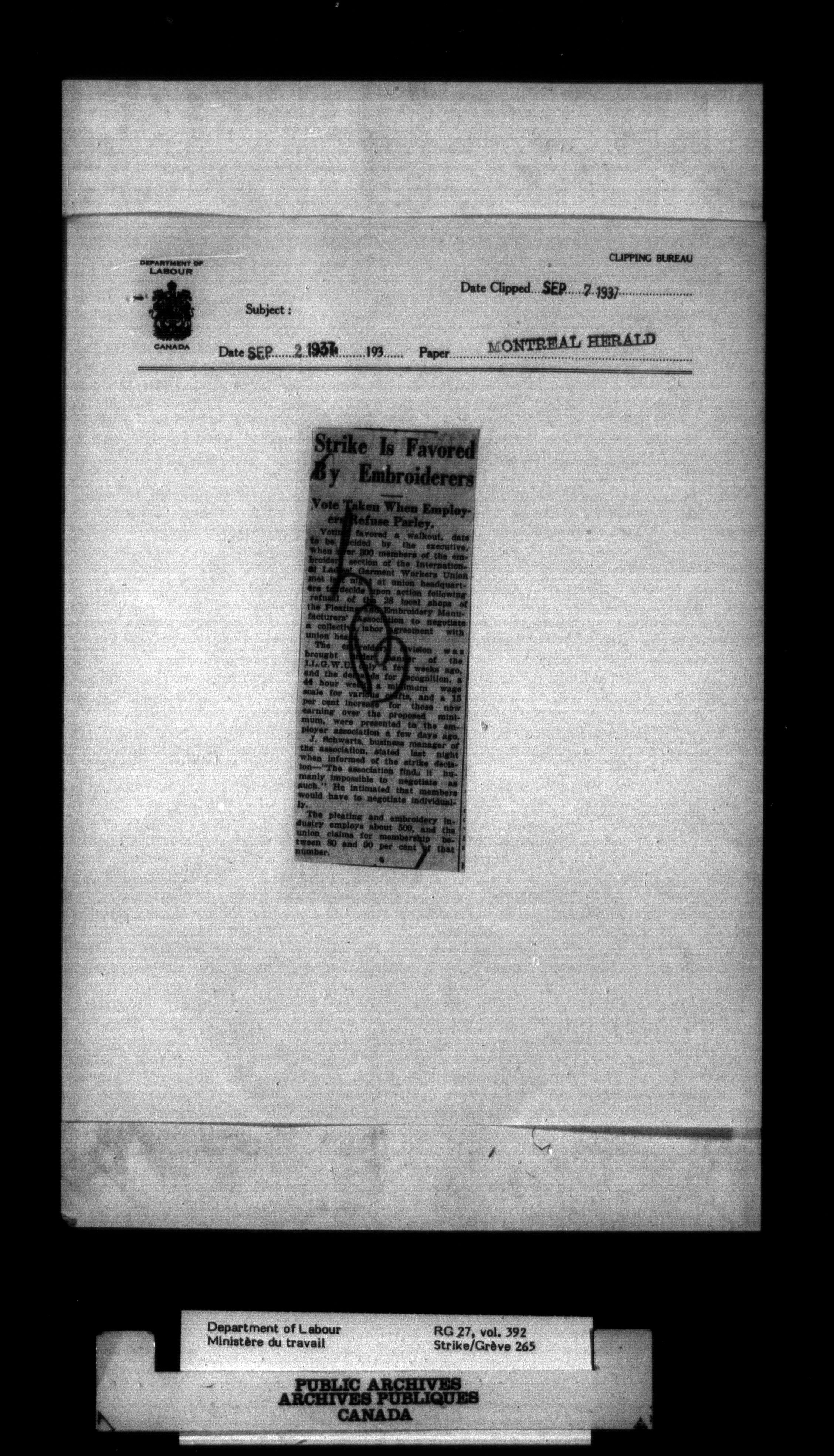 Department of Labour, Economics and Research Branch : Strikes and lockout files - 2999