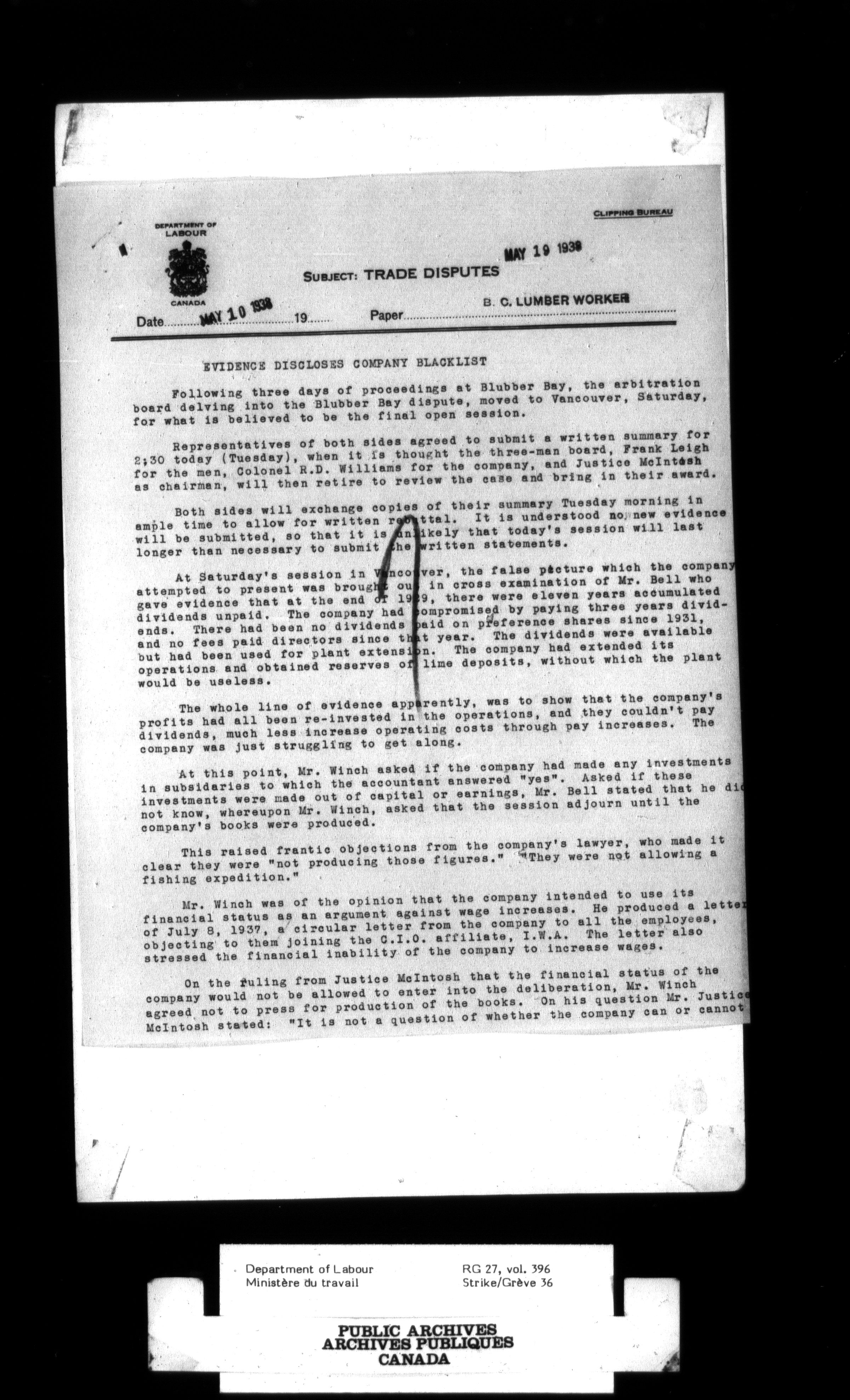 Department of Labour, Economics and Research Branch : Strikes and lockout files - 3004