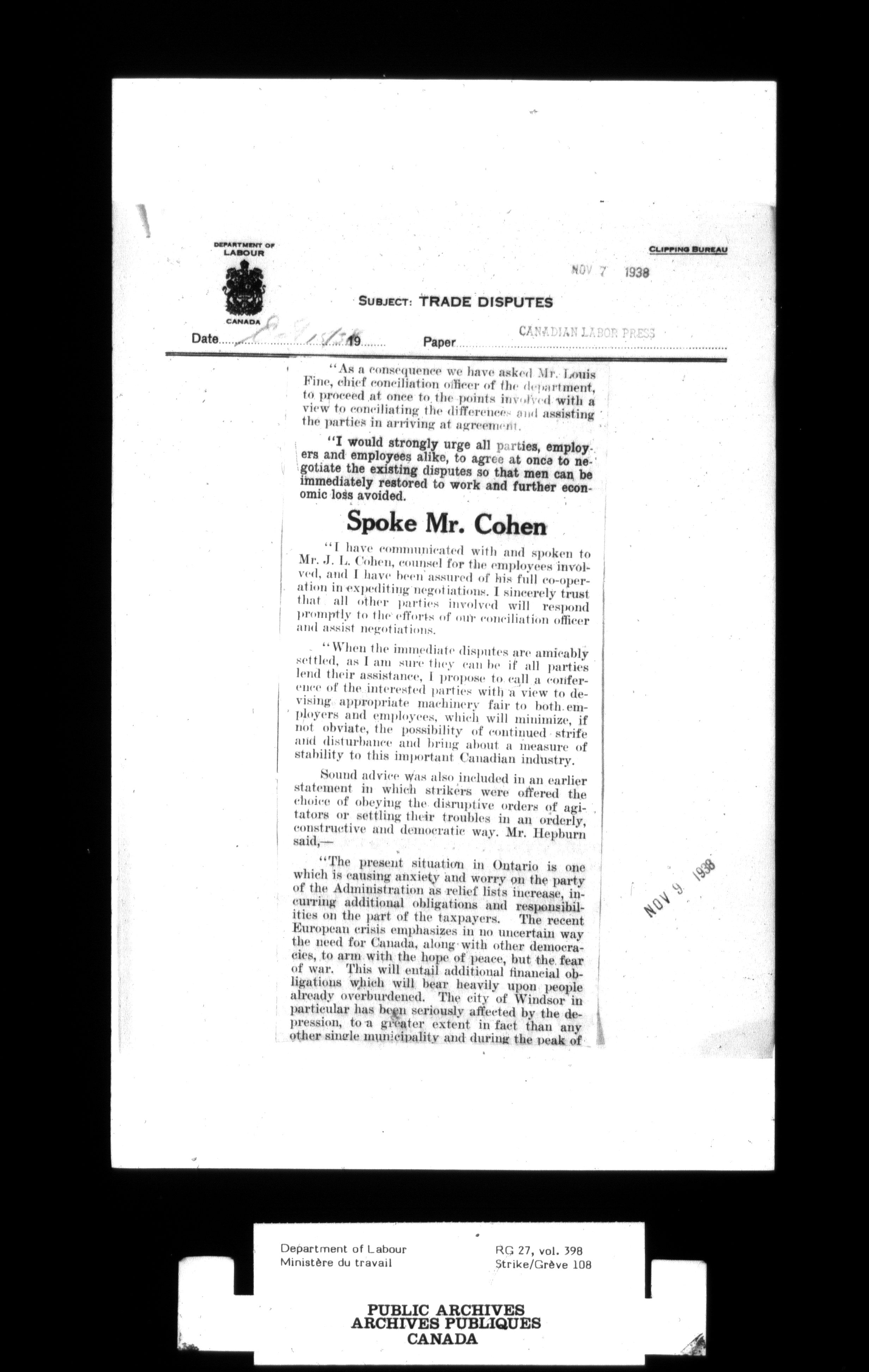Department of Labour, Economics and Research Branch : Strikes and lockout files - 3006