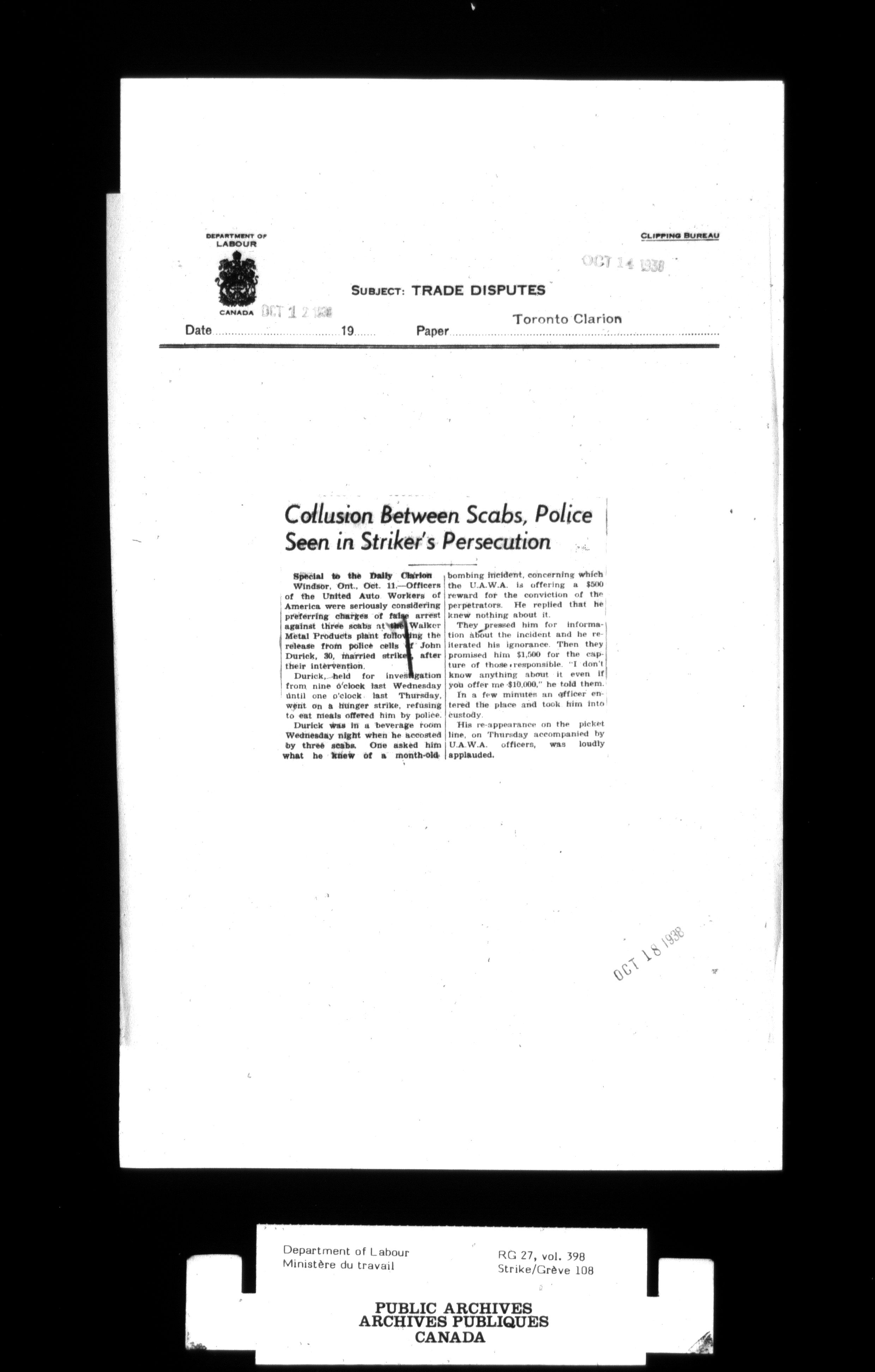 Department of Labour, Economics and Research Branch : Strikes and lockout files - 3006