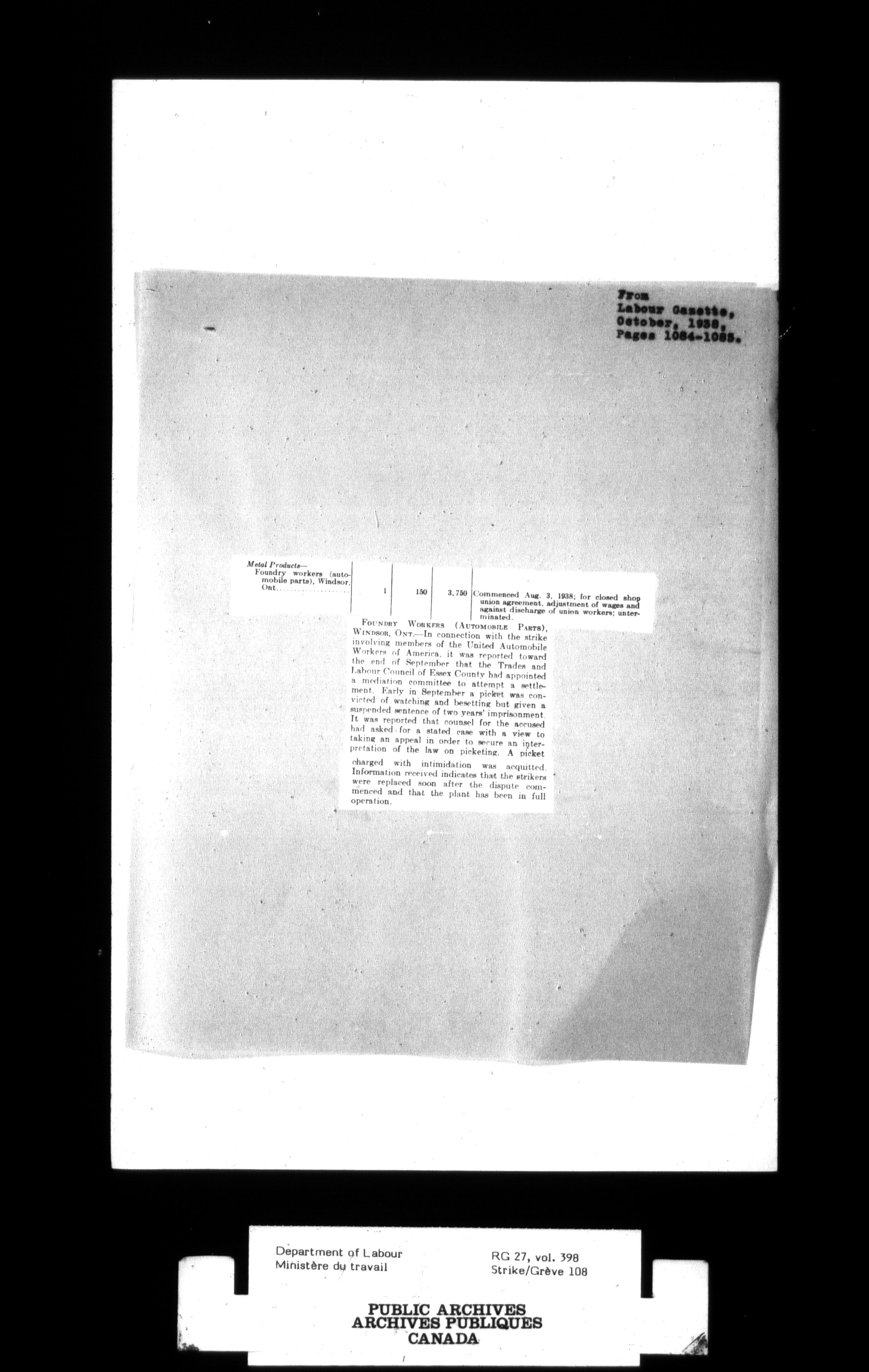 Department of Labour, Economics and Research Branch : Strikes and lockout files - 3006