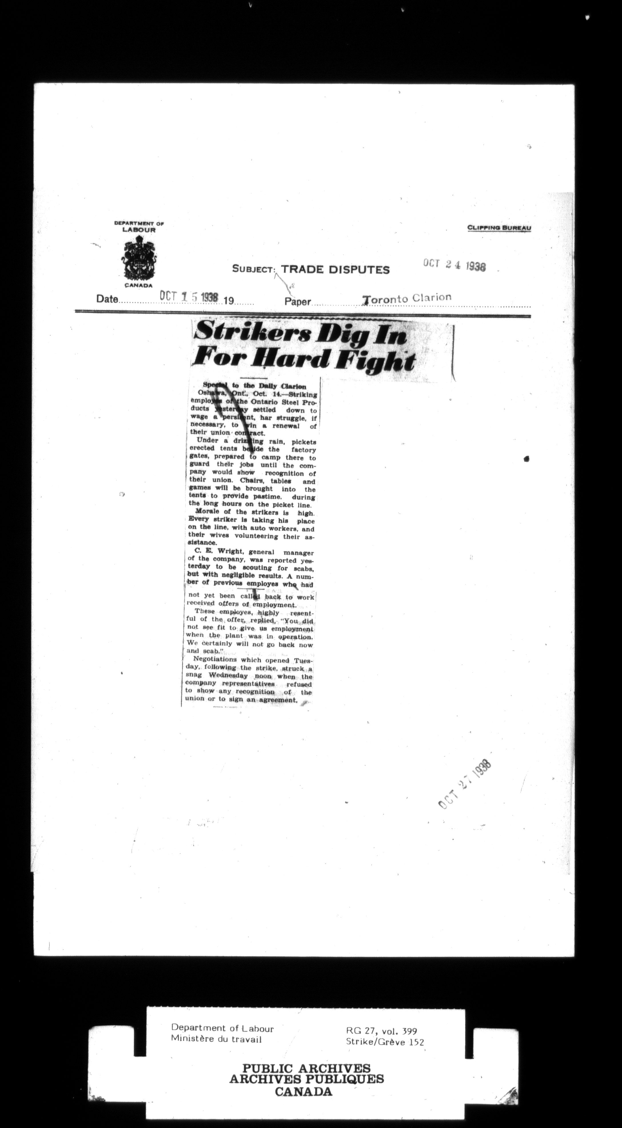Department of Labour, Economics and Research Branch : Strikes and lockout files : T-3007