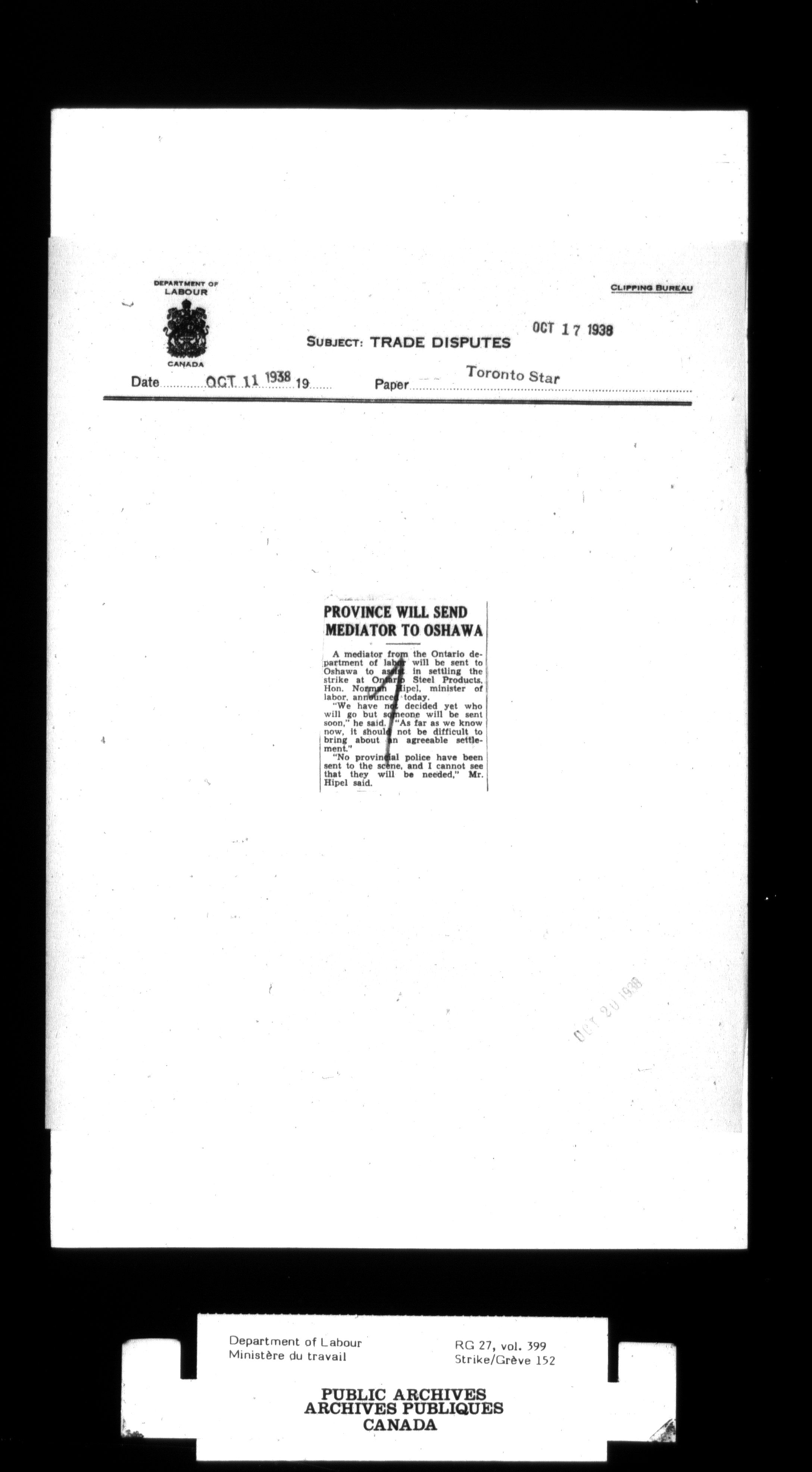 Department of Labour, Economics and Research Branch : Strikes and lockout files : T-3007
