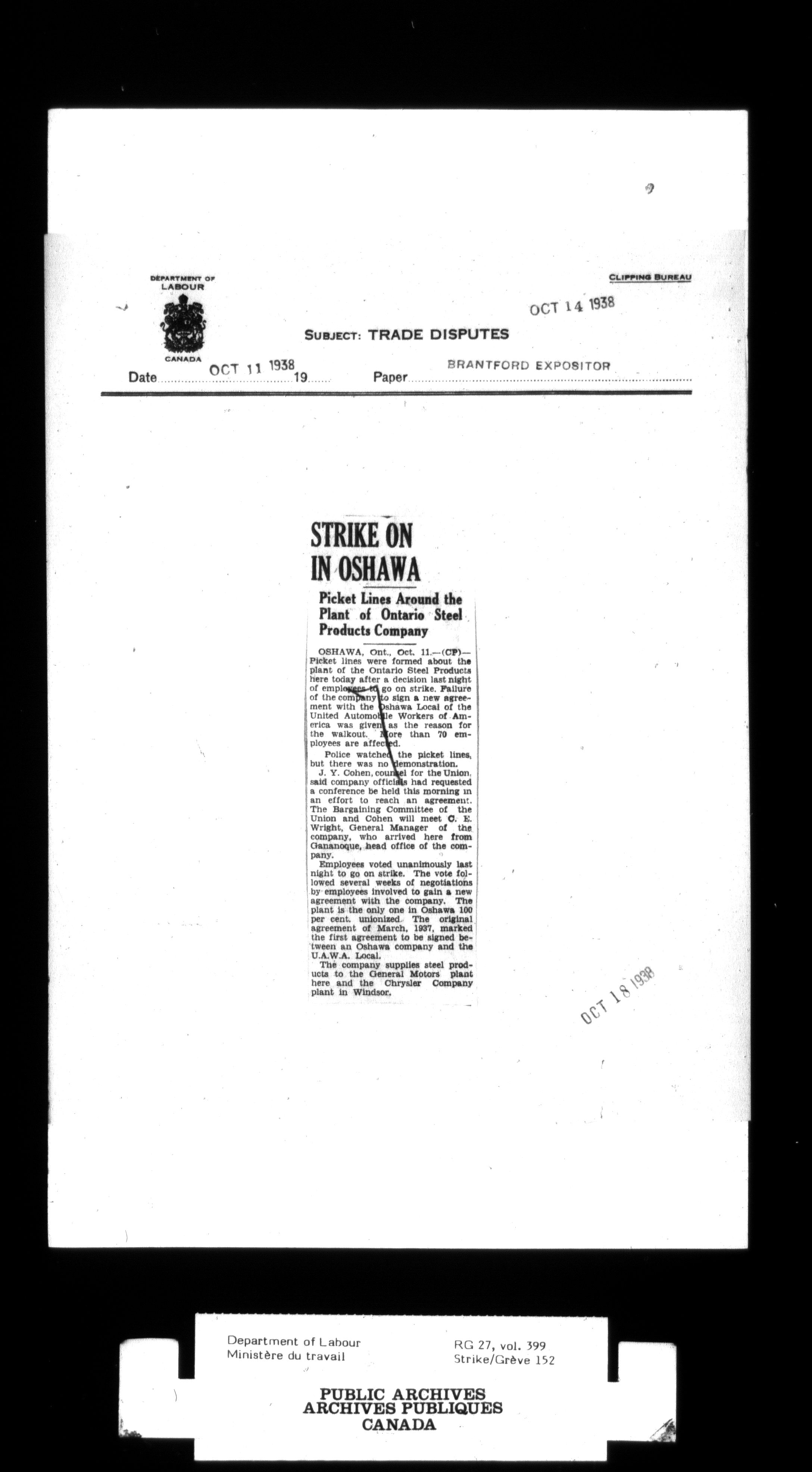 Department of Labour, Economics and Research Branch : Strikes and lockout files : T-3007