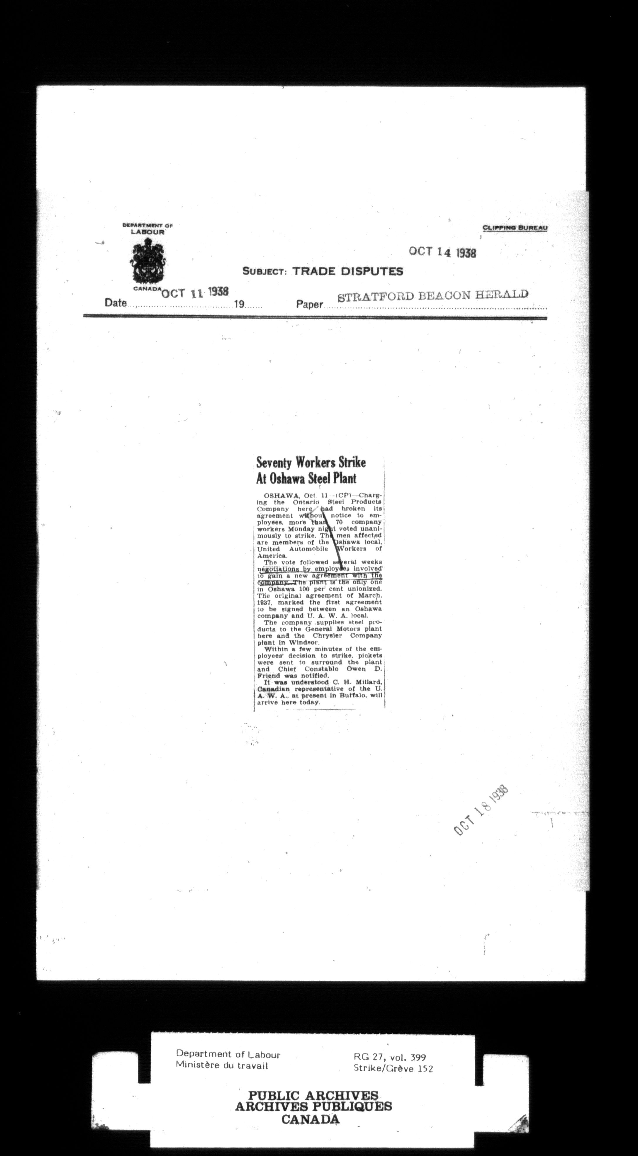 Department of Labour, Economics and Research Branch : Strikes and lockout files : T-3007