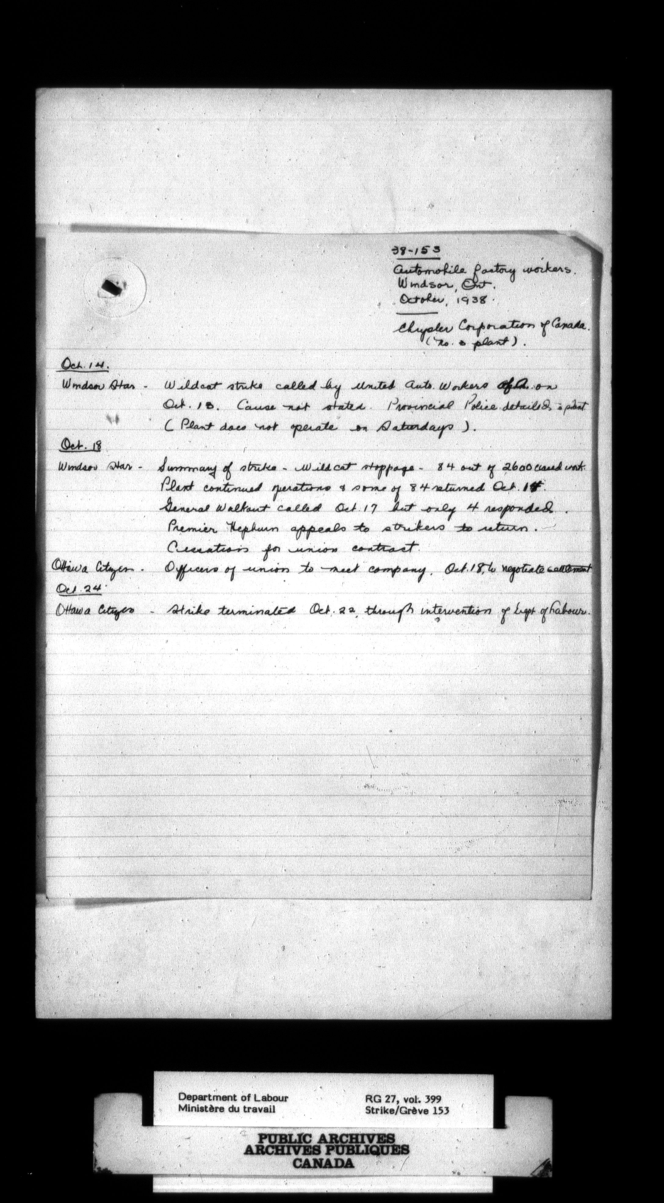 Department of Labour, Economics and Research Branch : Strikes and lockout files - 3007