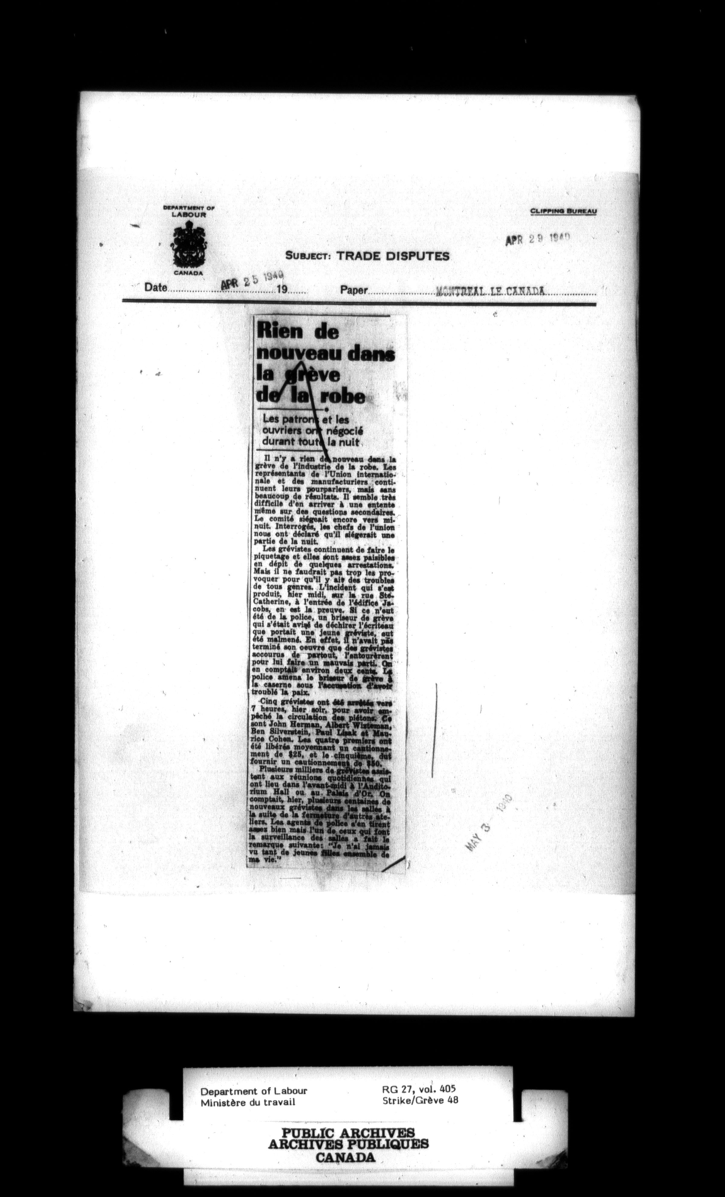 Department of Labour, Economics and Research Branch : Strikes and lockout files - 3013