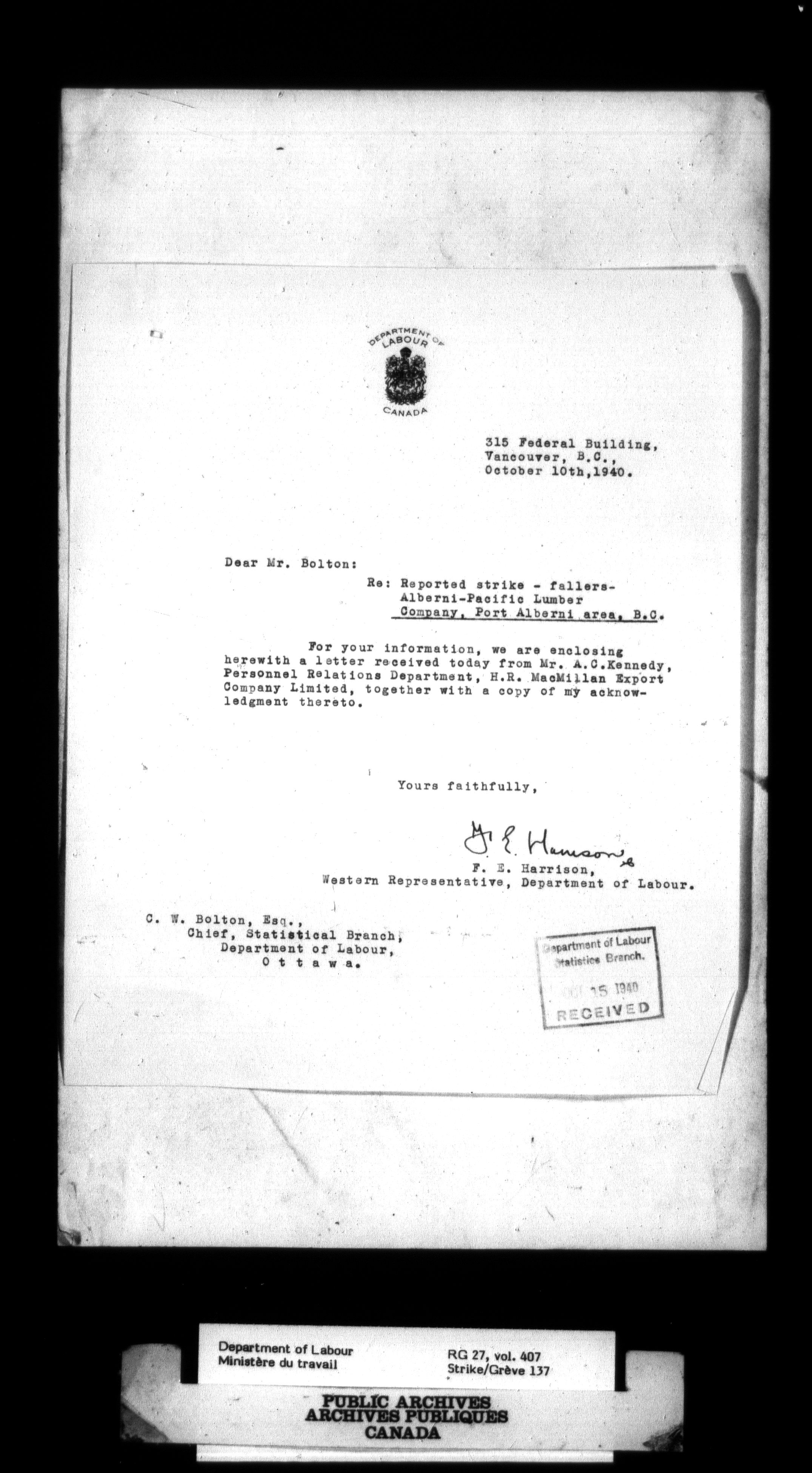 Department of Labour, Economics and Research Branch : Strikes and lockout files - 3015