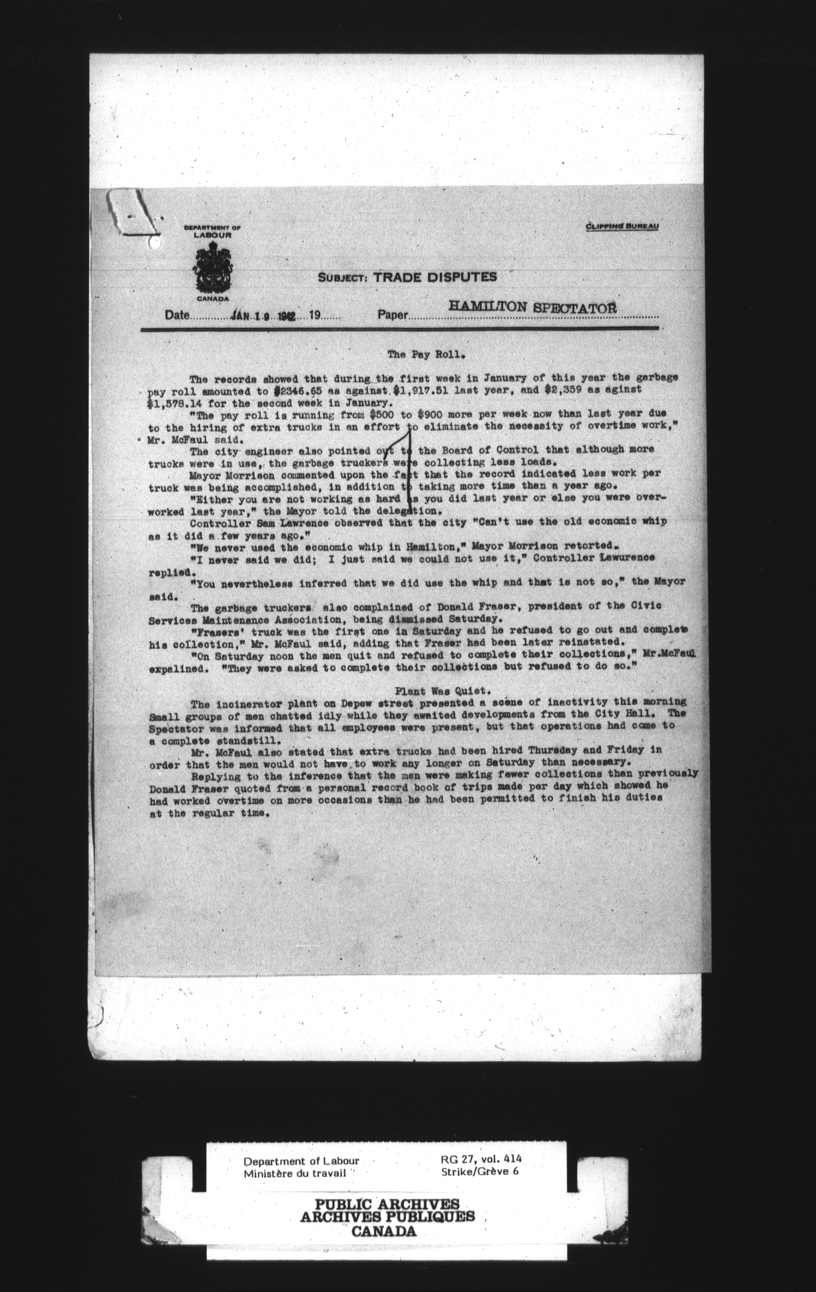 Department of Labour, Economics and Research Branch : Strikes and lockout files - 3021