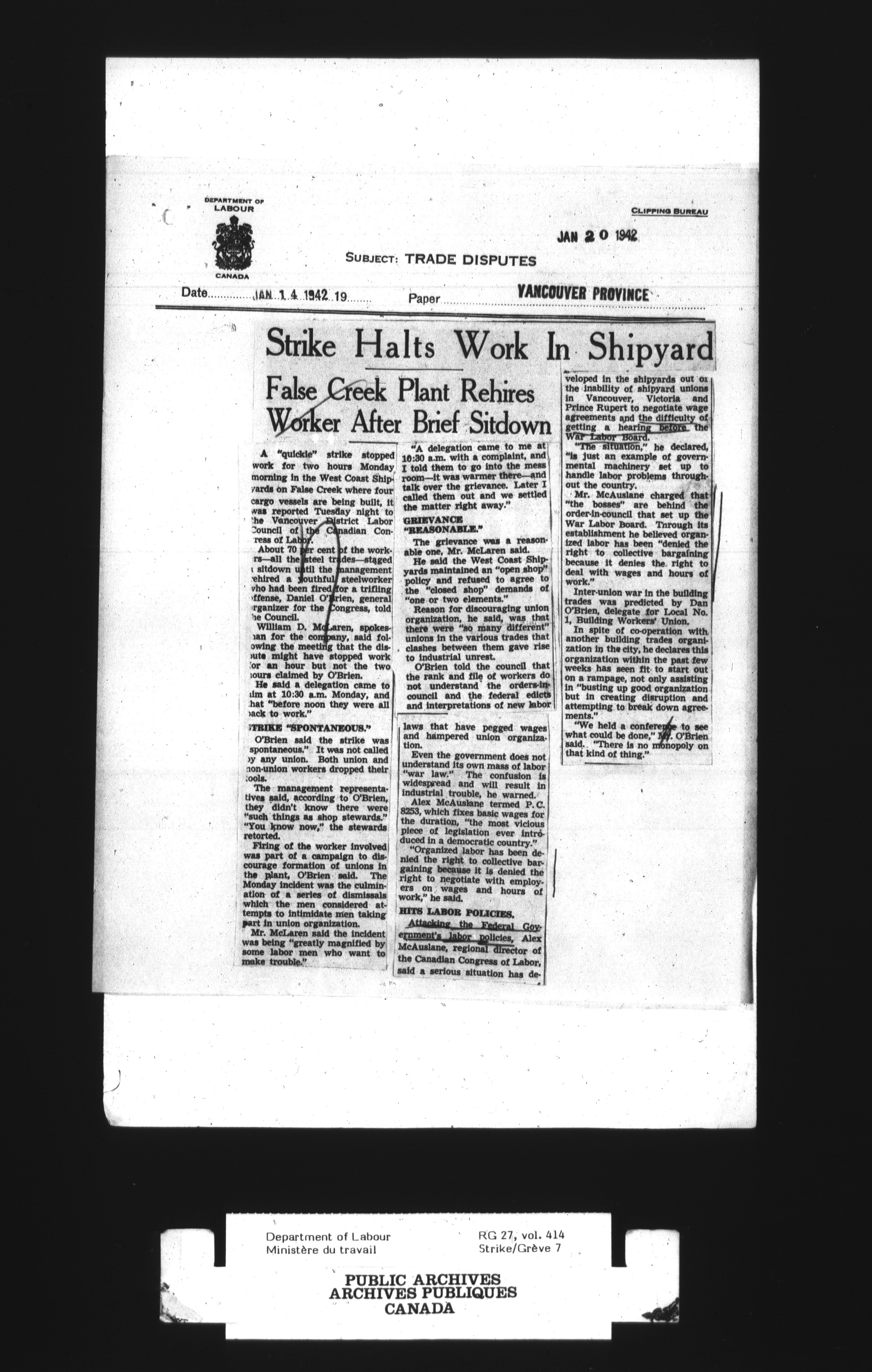 Department of Labour, Economics and Research Branch : Strikes and lockout files - 3021